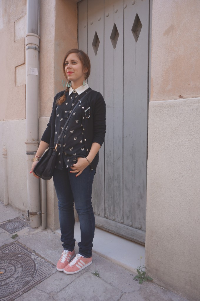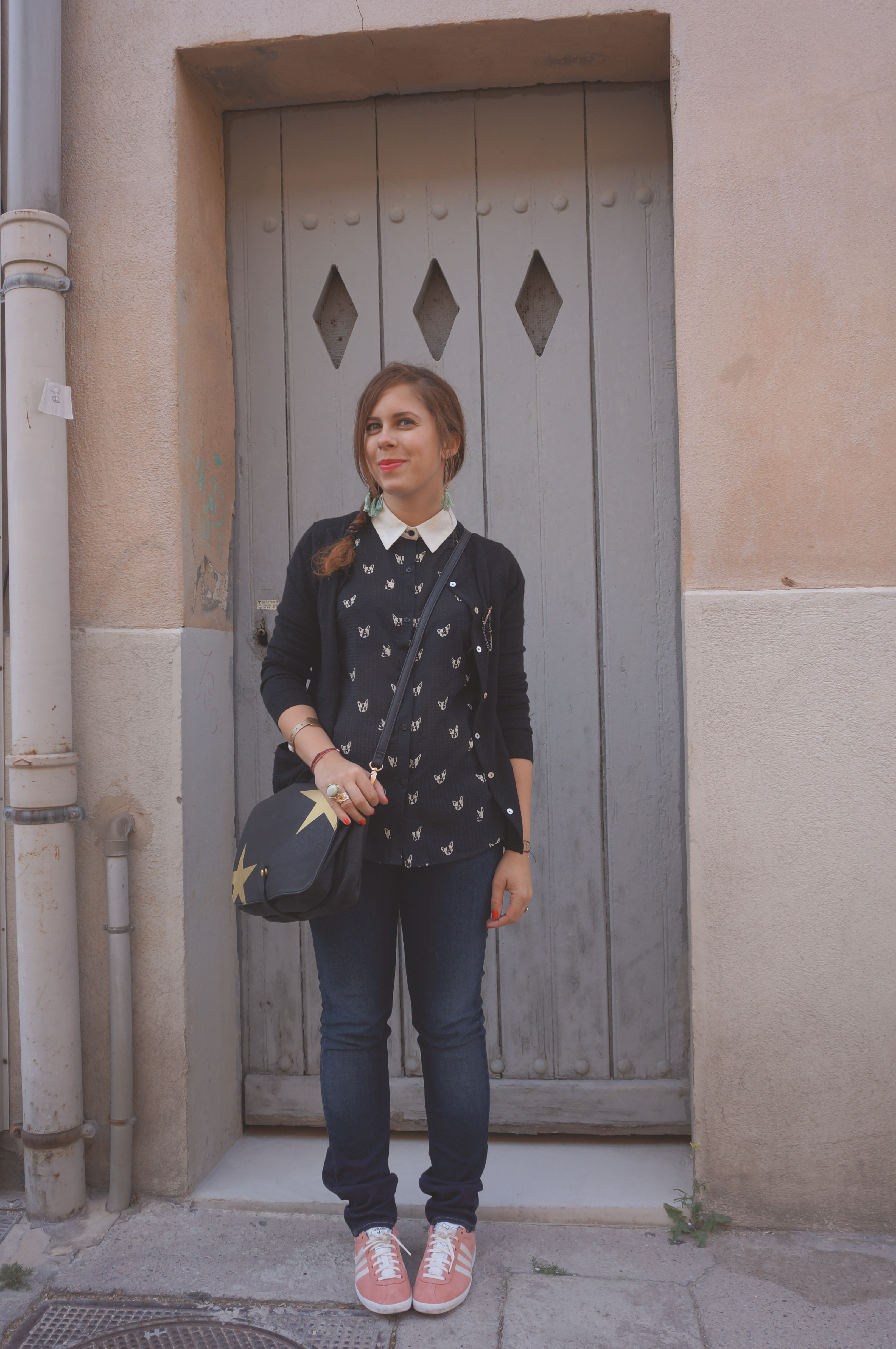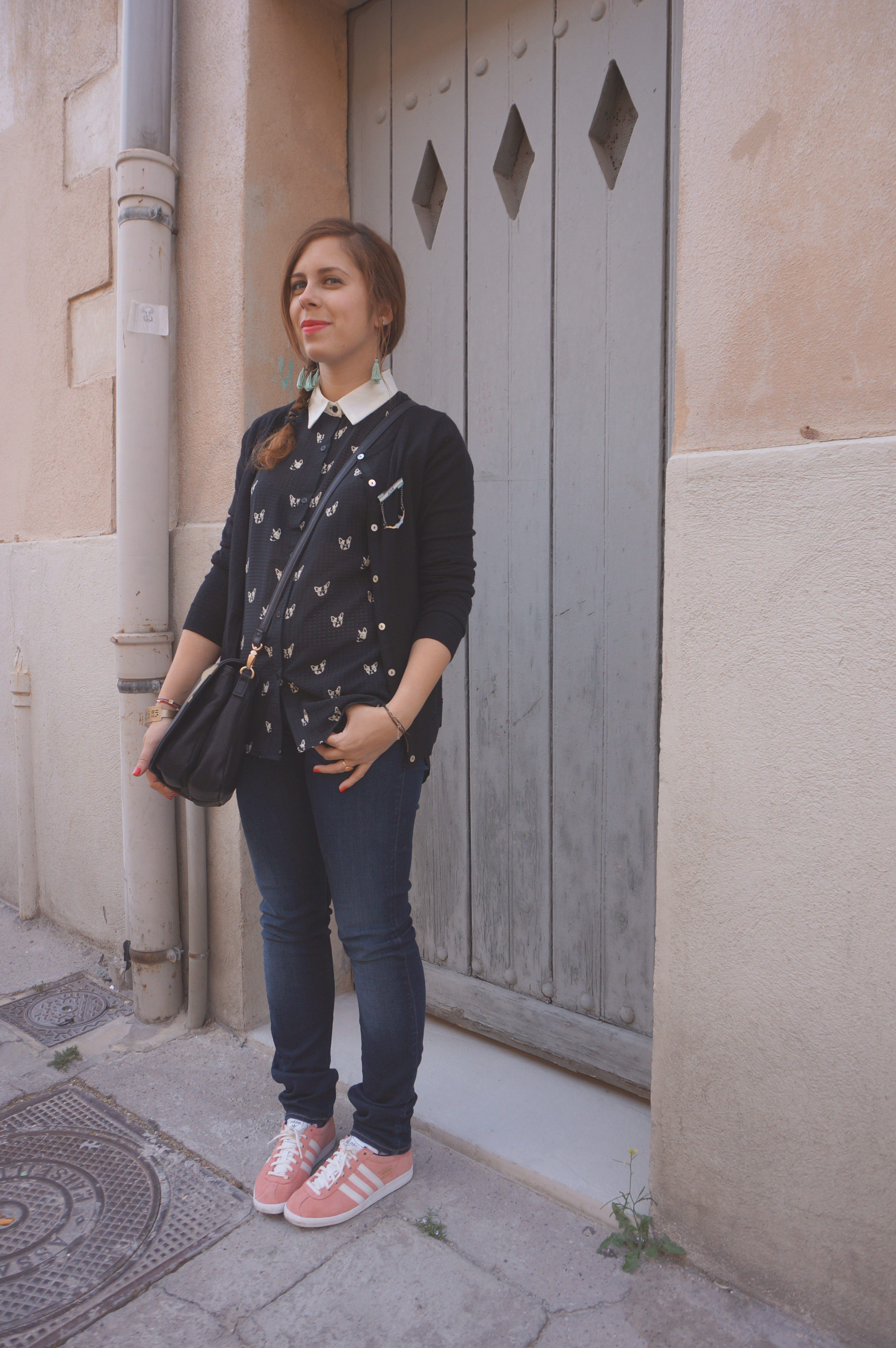 C’est comme ça que la semaine dernière, dans un jour de flemme modesque infinie, j’ai décidé d’associer mes nouvelles sneakers Adidas, des Gazelle rose girly, avec une chemise imprimée. Envie d’être chic mais à l’aise dans mes baskets, surtout que je partais en soirée avec mes amis de Yelp Marseille ! Le mélange peut sembler étrange, mais j’avoue que c’était la bonne association pour ma flemme ;)