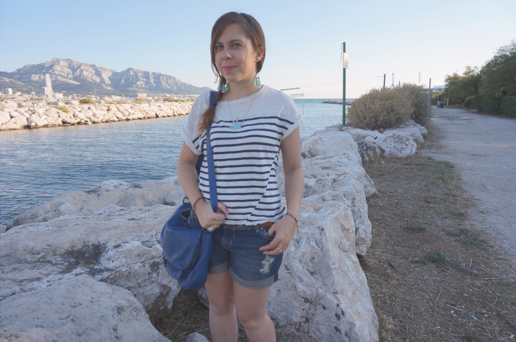 Pour ce look là, à vrai dire, je l’ai joué casual à fond, comme à mon habitude. On était en plus en route pour un apéro plage avec des amis de Yelp Marseille, résultat j’étais pas en mode apprêtée ;) Mais comme mon côté blogueuse mode ressort toujours, j’ai associé mes nouvelles sandales Les Tropéziennes très « graou graou » avec des rayures. Et comme d’hab, ça passe toujours !
