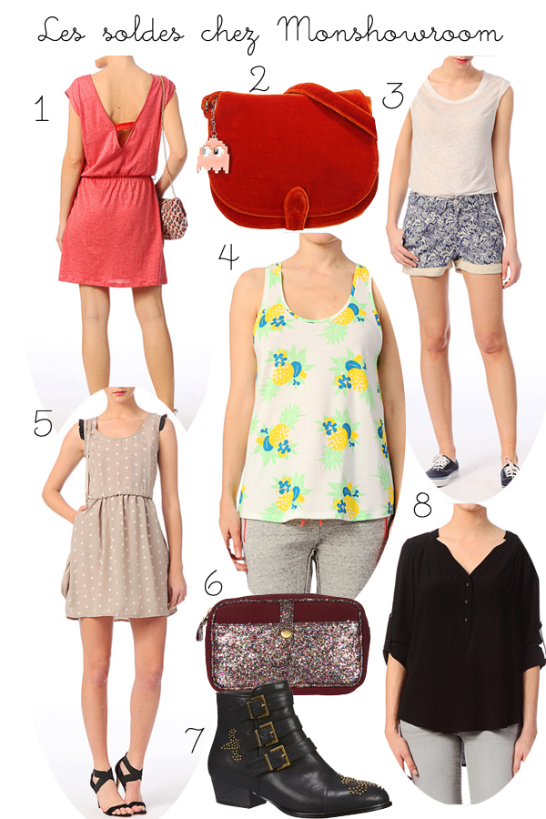 1. Robe irisée dos nu – Sessùn (48.50€ au lieu de 81€ ♥) – 2. Besace – Kling (19.50€ au lieu de 49€ ♥) – 3. Short imprimé – See U Soon (39.50€ au lieu de 79€ ♥) – 4. Débardeur – Petit Bateau (20€ au lieu de 40€ ♥) – 5. Robe imprimé coeurs – CompaniaFantastica (29€ au lieu de 49€ ♥) – 6. Pochette à paillettes – Petite Mendigote (13,50€ au lieu de 45€ ♥) – 7. Boots rock – Elite (27.50€ au lieu de 69€ ♥) – 8. Blouse – 2Two (34.50€ au lieu de 69€ ♥)
