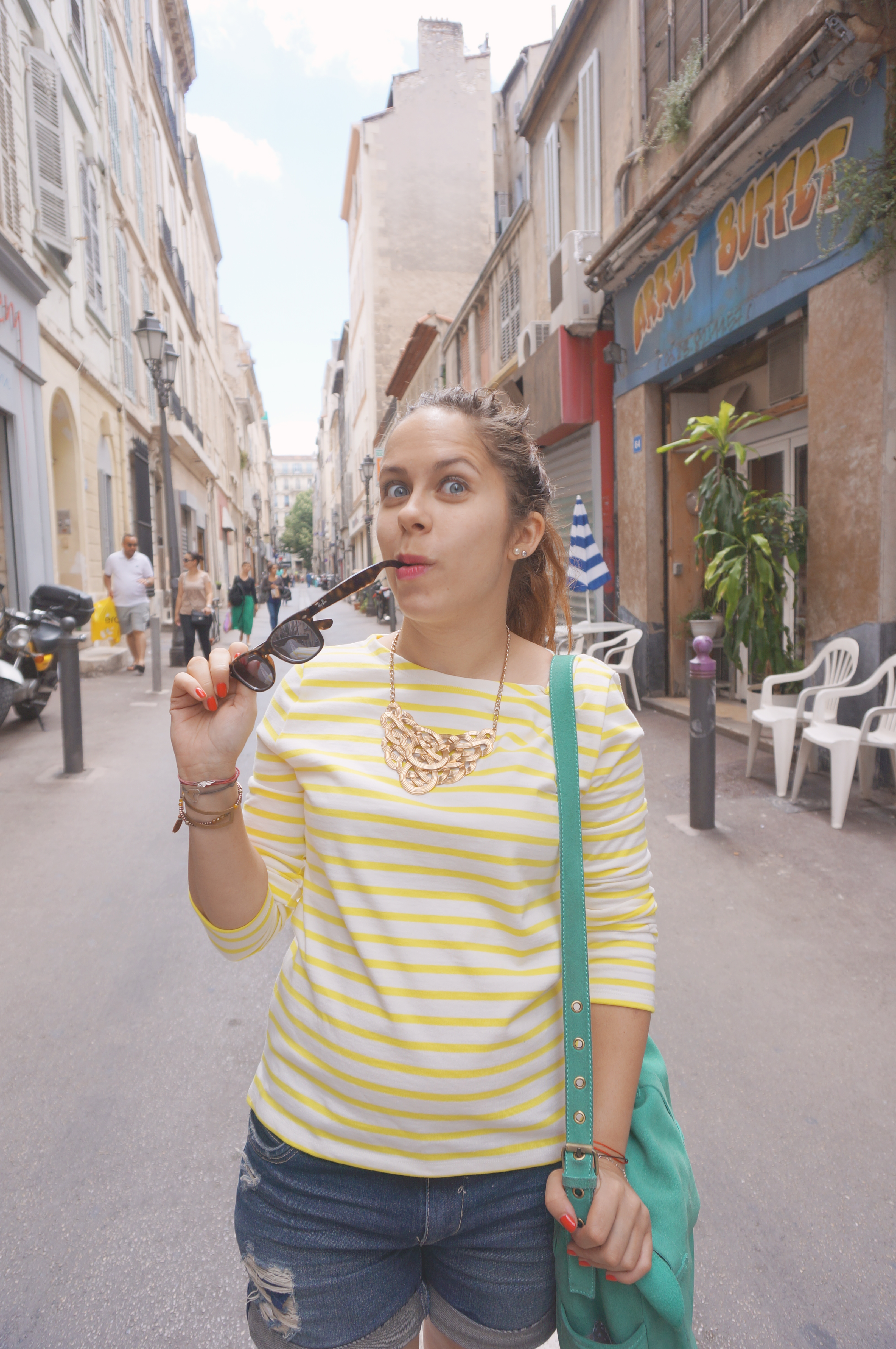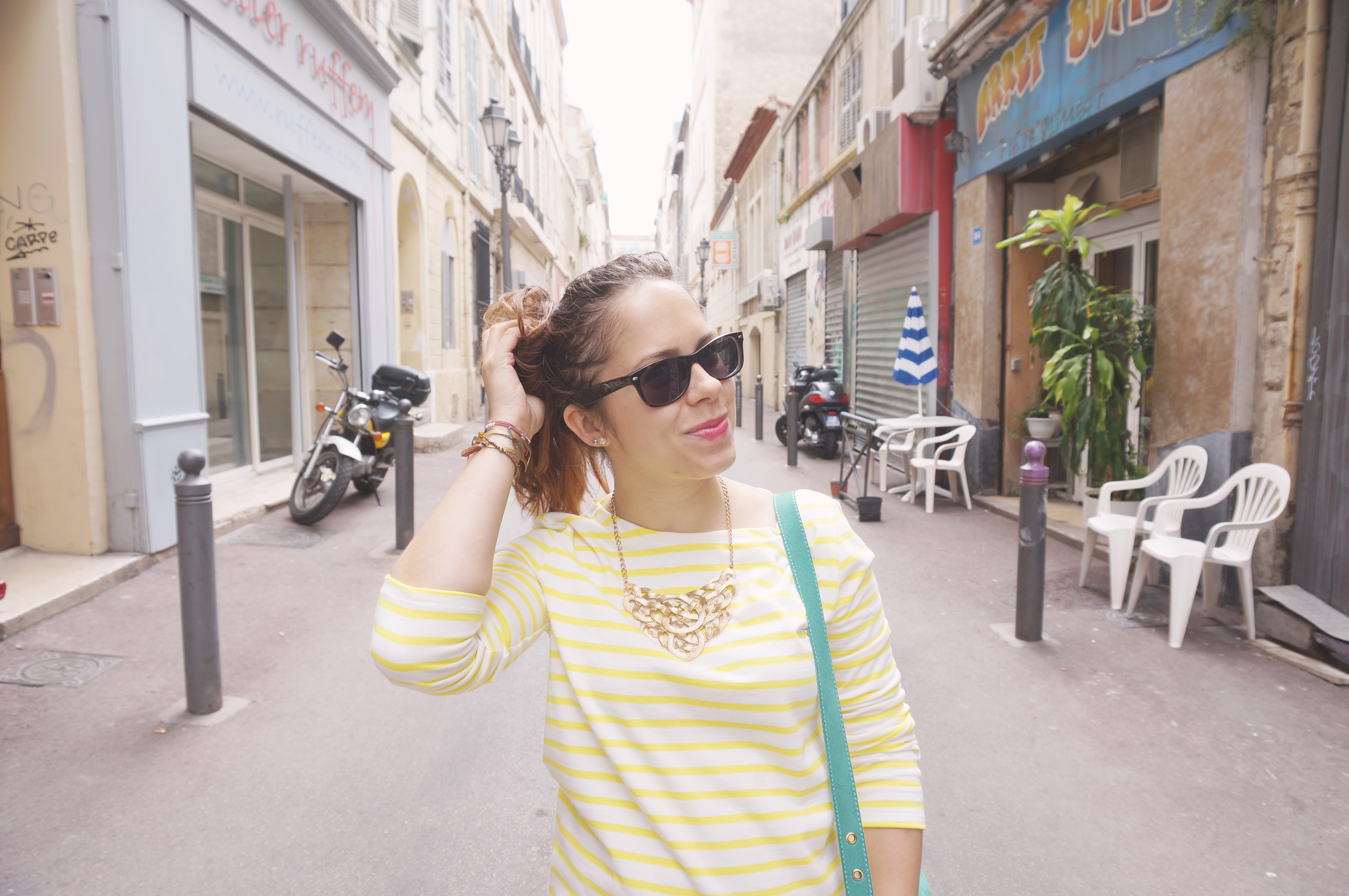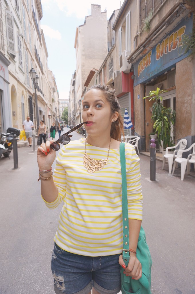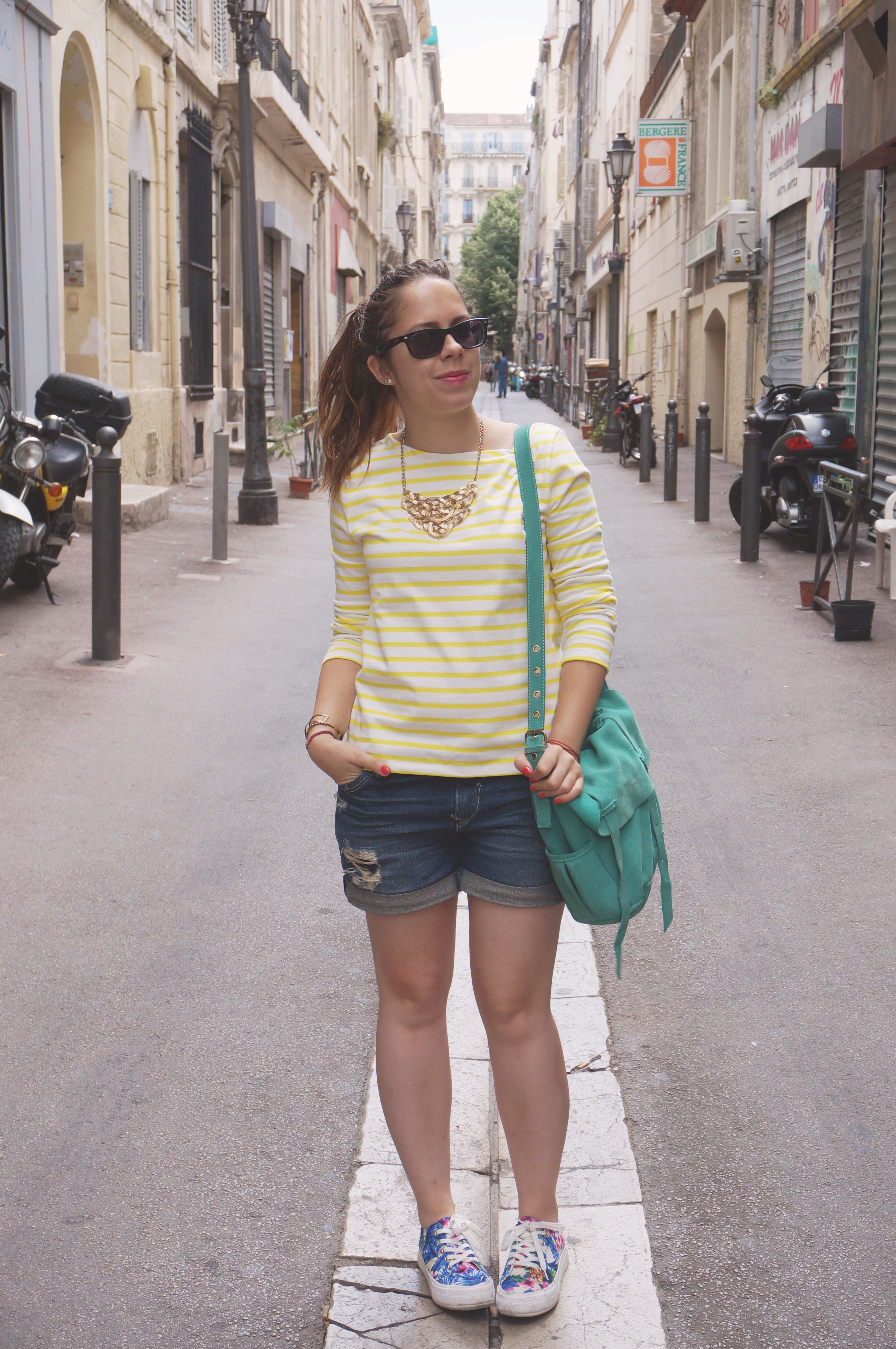 Pour ce nouveau look shooté en plein coeur de Marseille, j’ai décidé de continuer dans les looks estivaux (mais faciles à porter hein), en mixant les imprimés et les couleurs. Une marinière jaune, des baskets tropicales et mon sac Mila Louise (mon auto-cadeau d’anniversaire de l’année dernière) et le tour est joué !