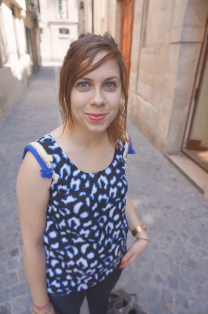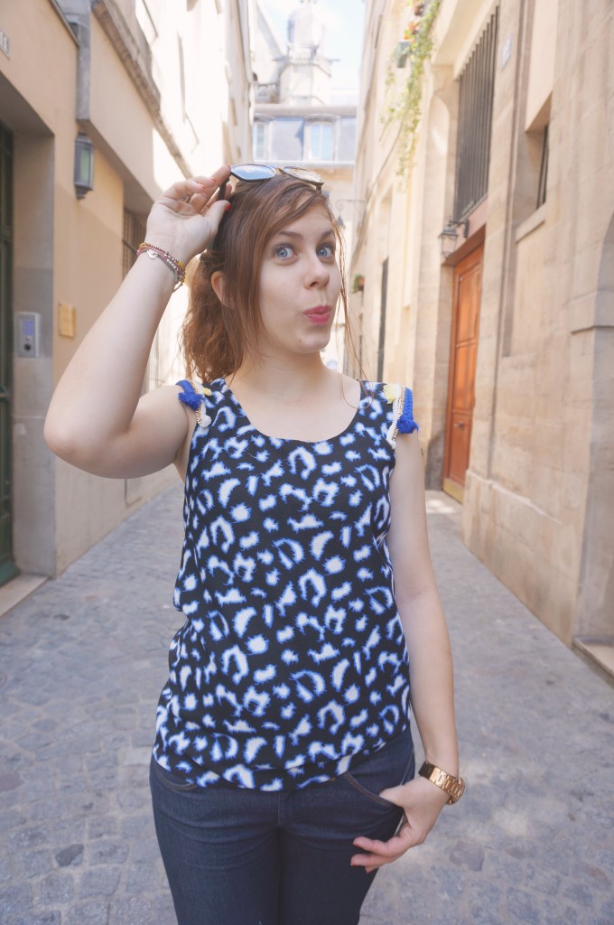 J’aime beaucoup tout le look ! Le top est très sympa. Je ne suis pas fan d’habitude de ce genre d’imprimé. Mais là, avec les pompons, j’adore !
