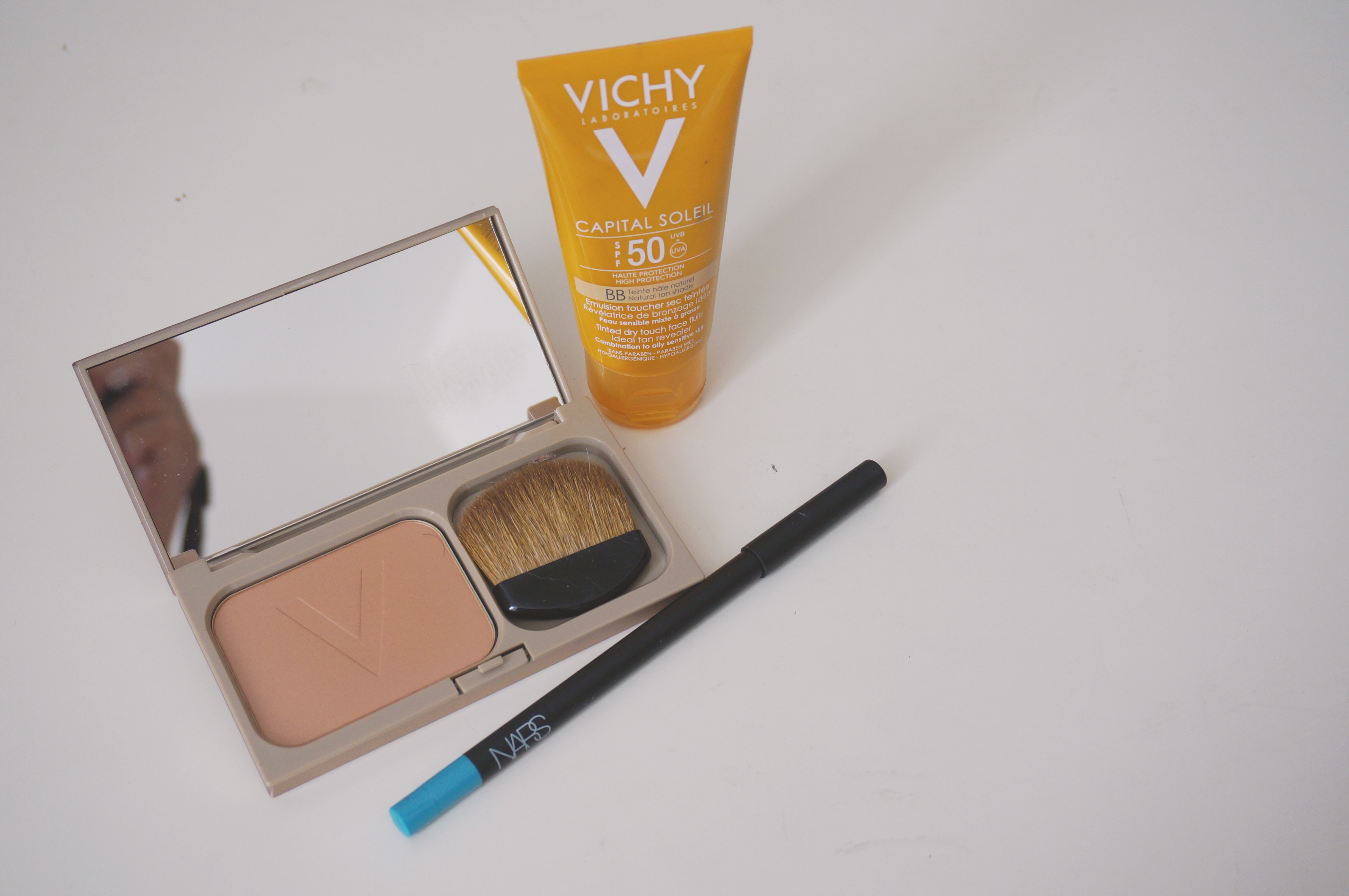 Du côté du maquillage, l’été, je n’en fais pas des tonnes : au contraire ! Avec la chaleur et la transpiration, le fond de teint fond comme neige au soleil, et la plupart des produits ne tiennent pas… Résultat, je la joue soft (et tant mieux pour la valise !) avec une BB Crème, de la poudre bronzante et un liner. Depuis quelques semaines, j’ai jeté mon dévolu sur la BB Crème Vichy qui contient un SPF50, parfait quand on vit au bord de la mer. Elle a une teinte très proche de la mienne, ce qui est un peu perturbant car la plupart du temps, j’ai l’impression de ne pas être maquillée, mais elle cache au moins les imperfections ;)
