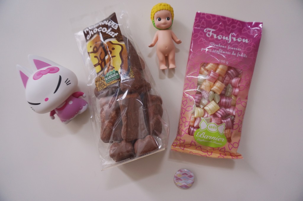 Des froufrous de la marque Barnier. Ces sortes de berlingots sont fourrés à la confiture, et rien que de les voir dans leur paquet, j’ai l’eau à la bouche !