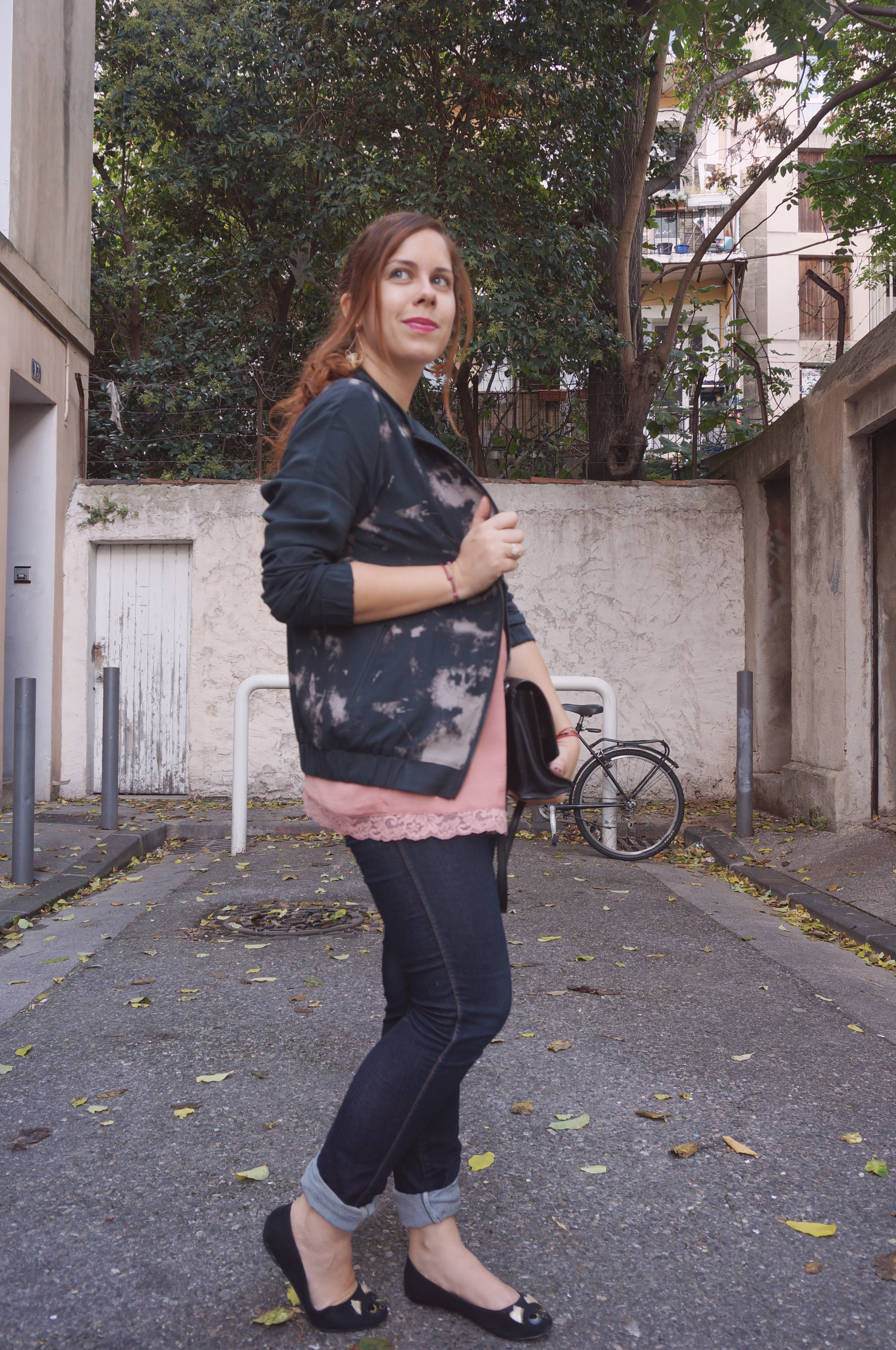 Alors, quand j’ai vu ce caraco chez Monoprix la semaine dernière, je l’ai pris en rose pale. Il existait en bleu marine et en kaki, mais j’ai décidé de sortir de ma zone de confort ^^ Et hop, en rose dans mon panier ! Idem pour cette veste O’Neill, une marque que je n’avais pas porté depuis mon adolescence. J’ai craqué pour son imprimé tie&dye, et je me suis dit que je pouvais relever le defi d’en faire une tenue girly :)