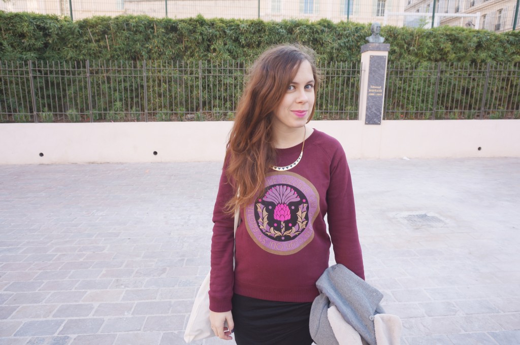 Cette tenue te va super bien, et j’adore le bordeaux de ton pull !