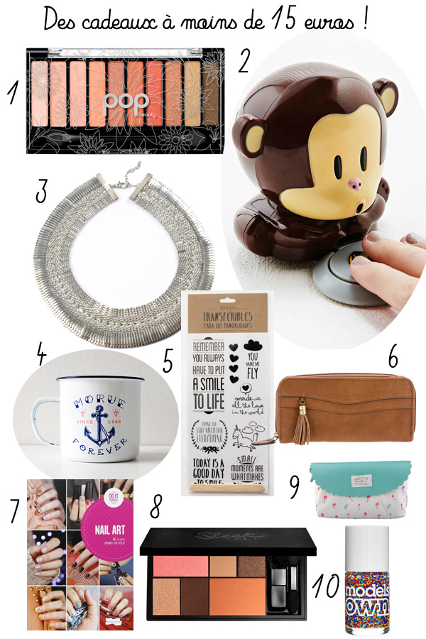 Histoire de terminer la semaine en beauté, et parce que vous êtes nombreuses à me demander des idées de cadeaux à glisser sous le sapin, j’ai décidé de vous concocter une sélection de cadeaux sympas à moins de 15 euros ! Que vous ayez un petit budget pour gâter vos proches, ou que vous soyez à la recherche de petits cadeaux supplémentaires à offrir à vos proches, mon petit doigt me dit que cette sélection devrait vous aider à jouer les Mère Noël ;)
