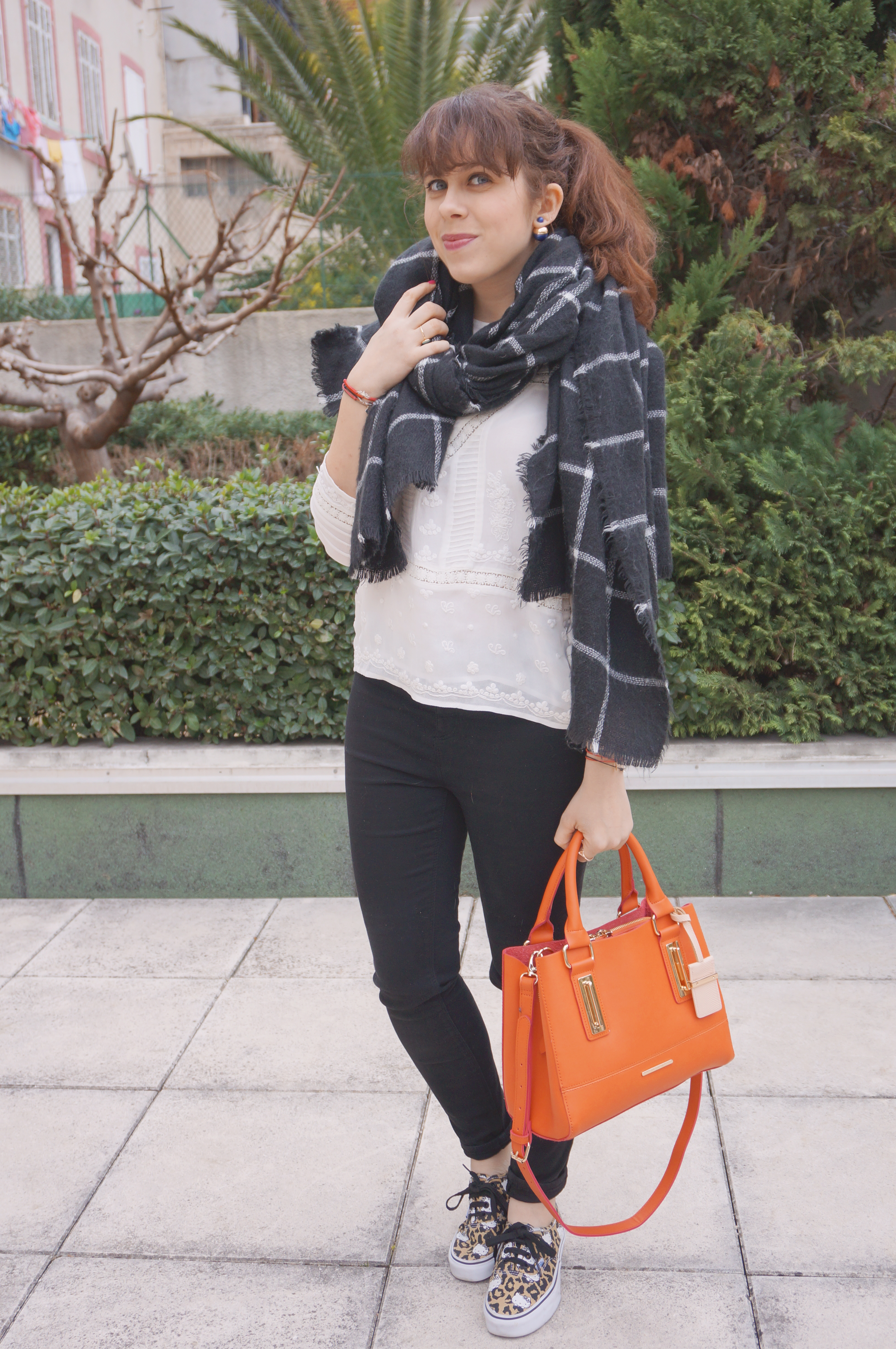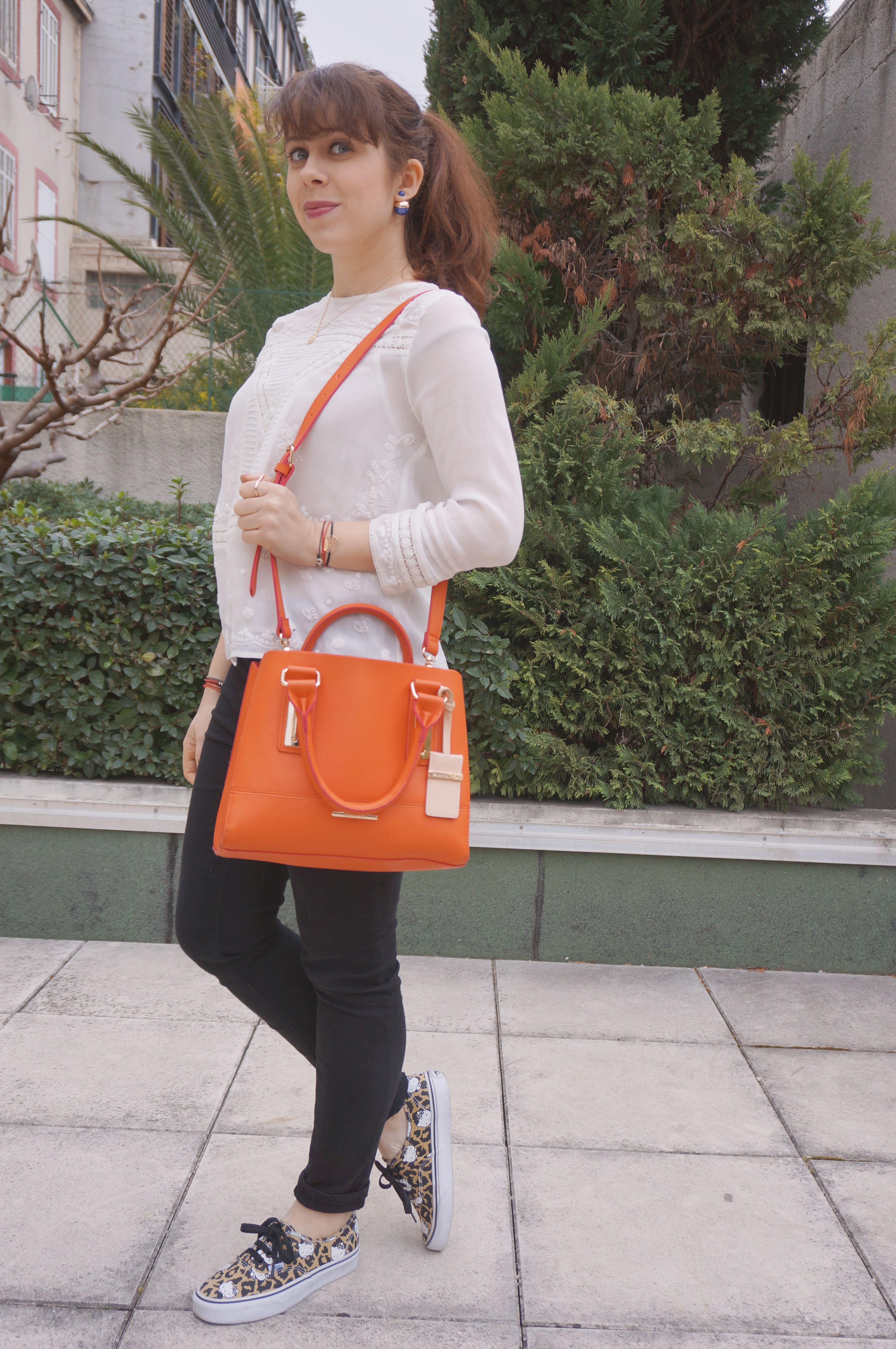 Pour le reste de ma tenue, j’ai choisi une blouse légère, avec des broderies. C’est typiquement le genre de pièces que j’affectionne, j’en possède déjà quelques modèles dans mon dressing. Ca se porte facilement, été comme hiver, c’est féminin et casual à la fois… J’ai opté aussi pour un sac orange, histoire de dynamiser la tenue ! J’aime bien avoir des sacs originaux, vous l’avez déjà remarqué sur le blog. Pour moi, mieux vaut une tenue classique rehaussée d’accessoires colorés qu’une tenue hyper colorée qui nous fait ressembler à un clown ;)