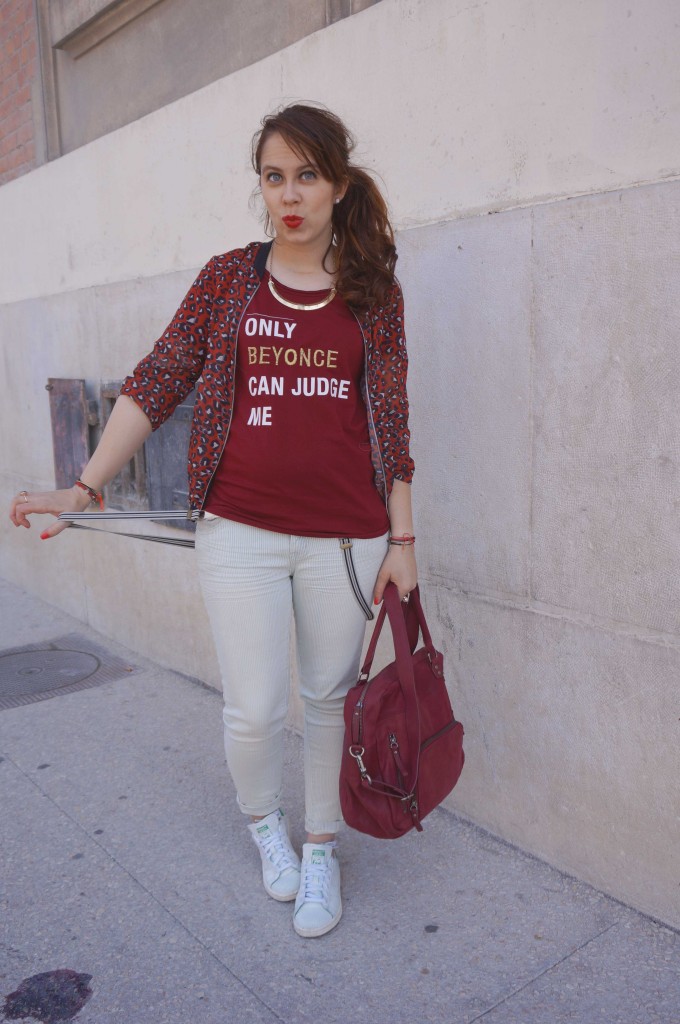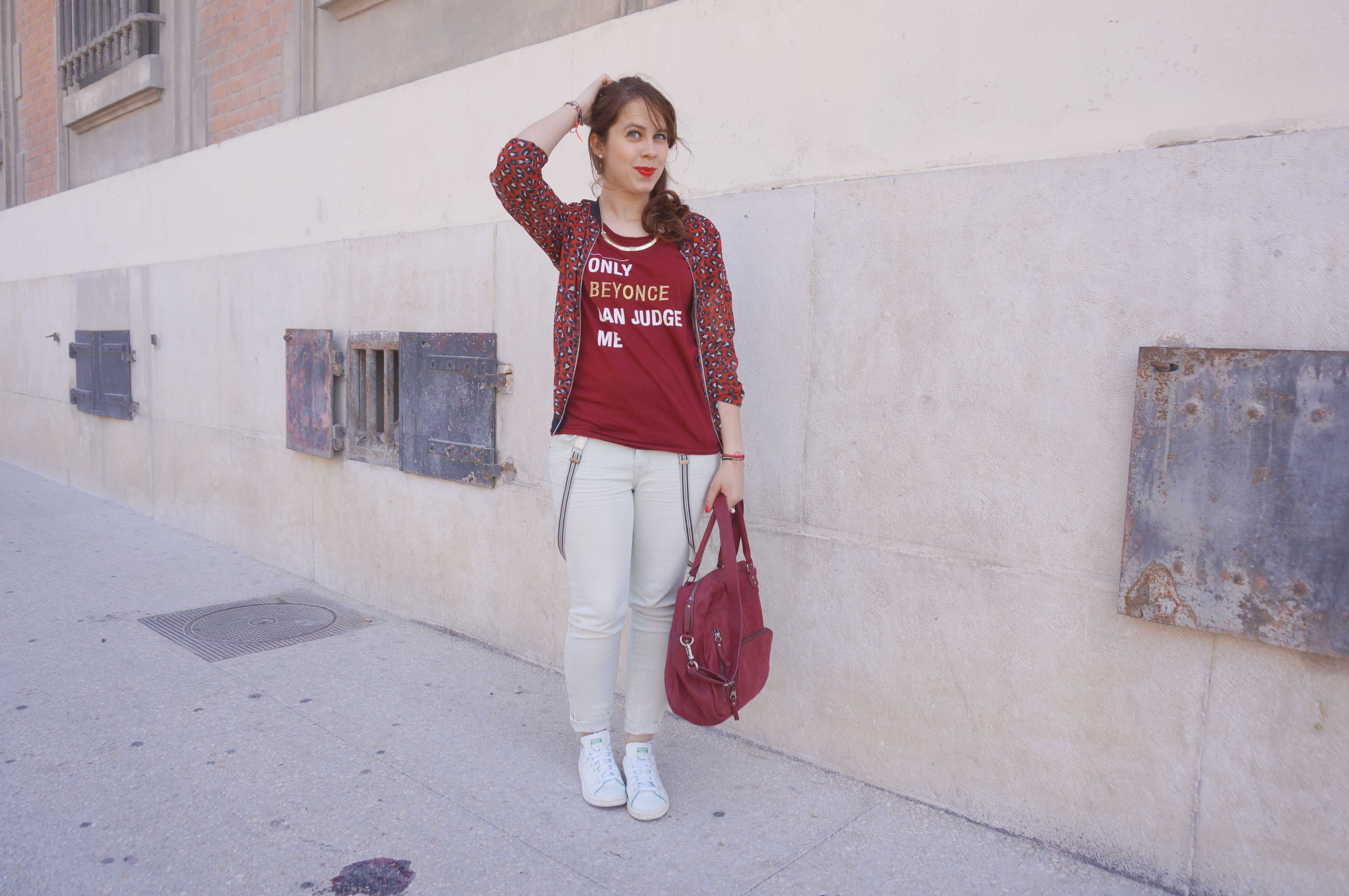 Jaime vraiment ce look et surtout les teeshirt a message et comment dire celui là est top !! A lui seul il fait le look. Quand au pantalon avec les petites rayures il faut aimer et tu l’habilles vraiment bien. Moins fan des bretelles mais ca fait son charme et un look un peu « rock » qui te vas bien. Super look