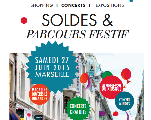 Samedi 27 Juin, à l’occasion du 1er weekend des soldes, les rues du centre ville de Marseille vont s’animer sous la houlette de l’association Marseille Centre, qui regroupe les commerçants du quartier. L’occasion de découvrir les décorations placées rue Saint Ferréol pendant toute la durée des soldes (un petit conseil : levez la tête, c’est là haut que ça se passe ! ^^) mais aussi de faire le plein de bonnes affaires ! :)