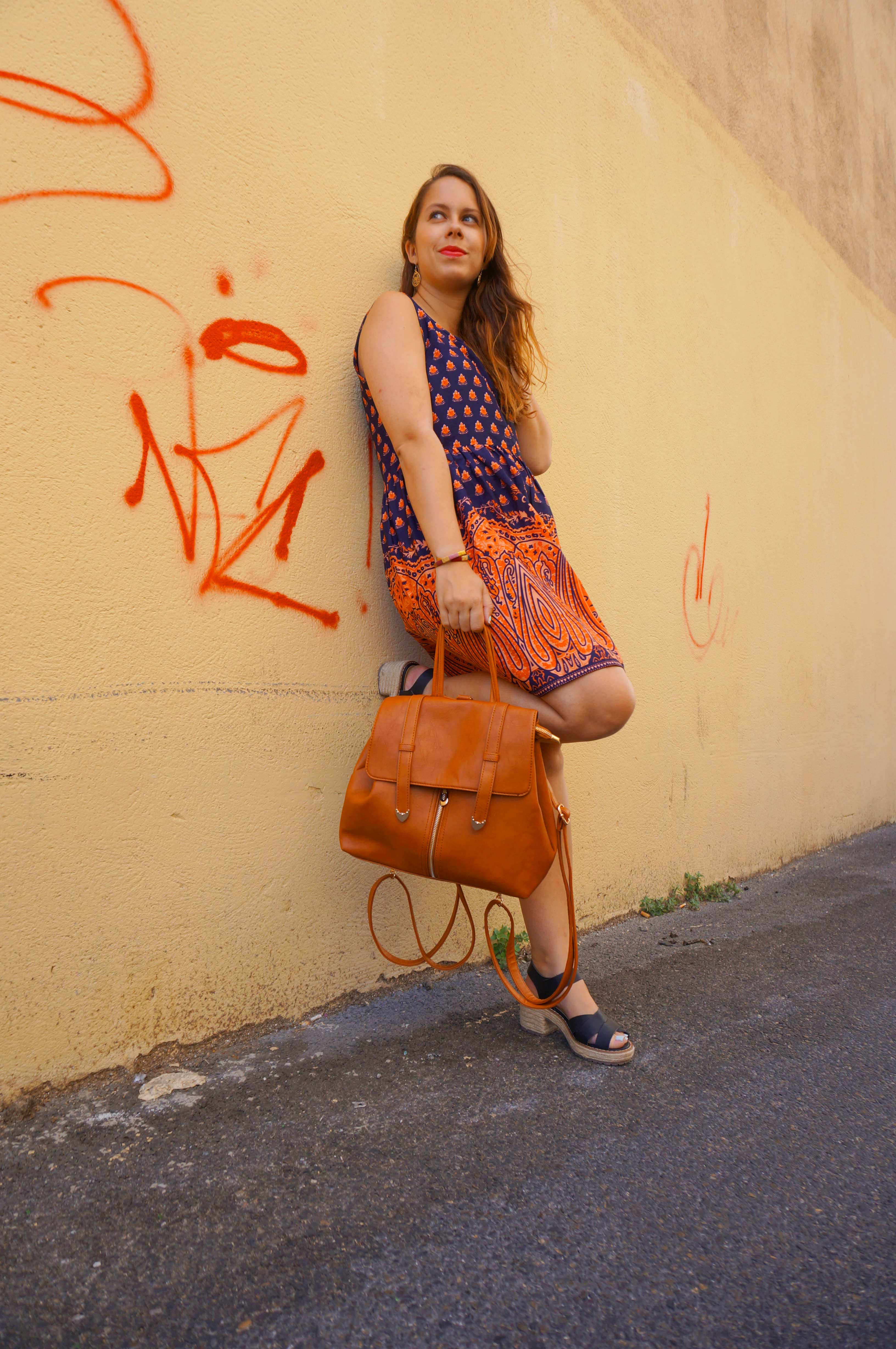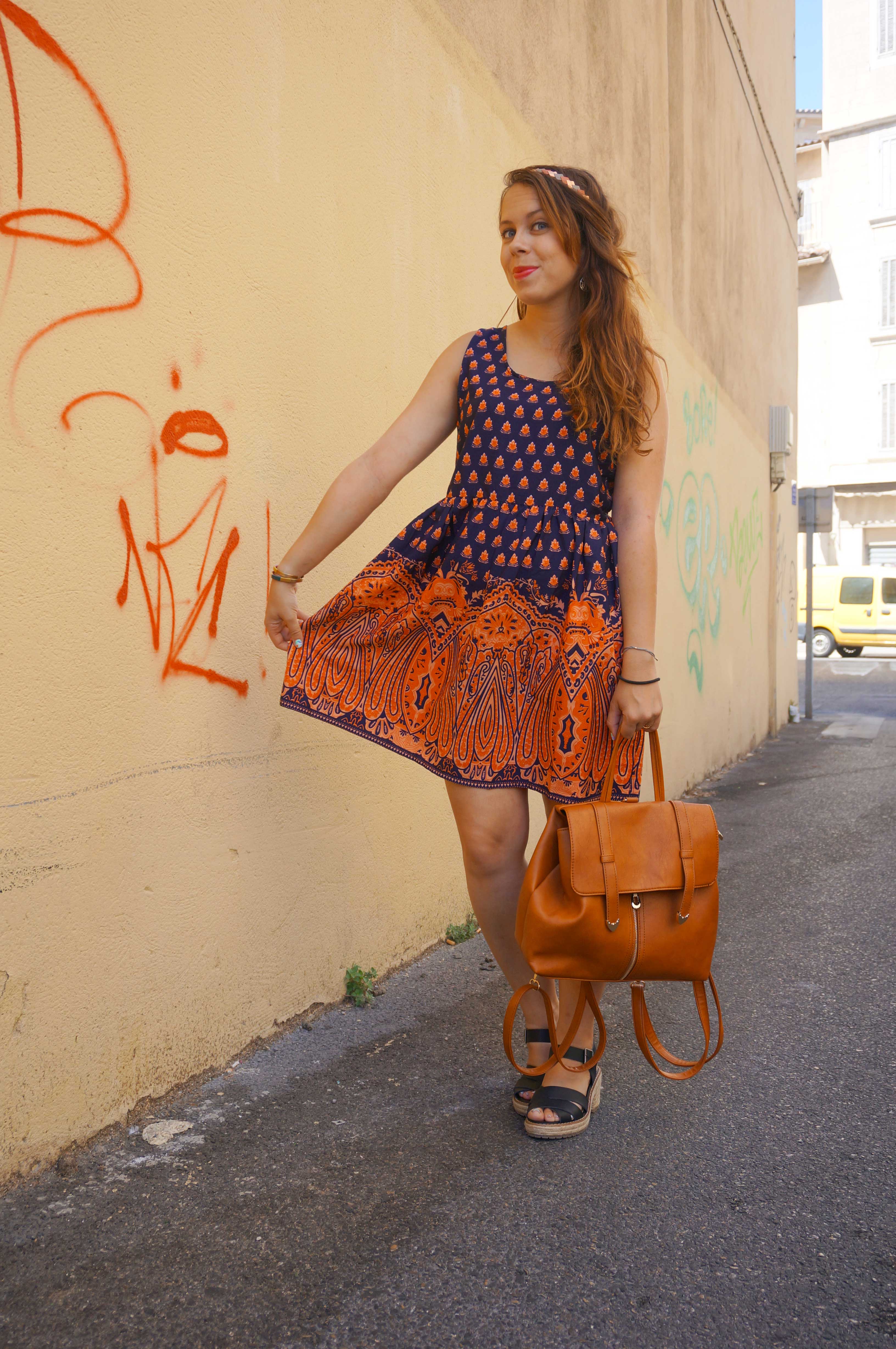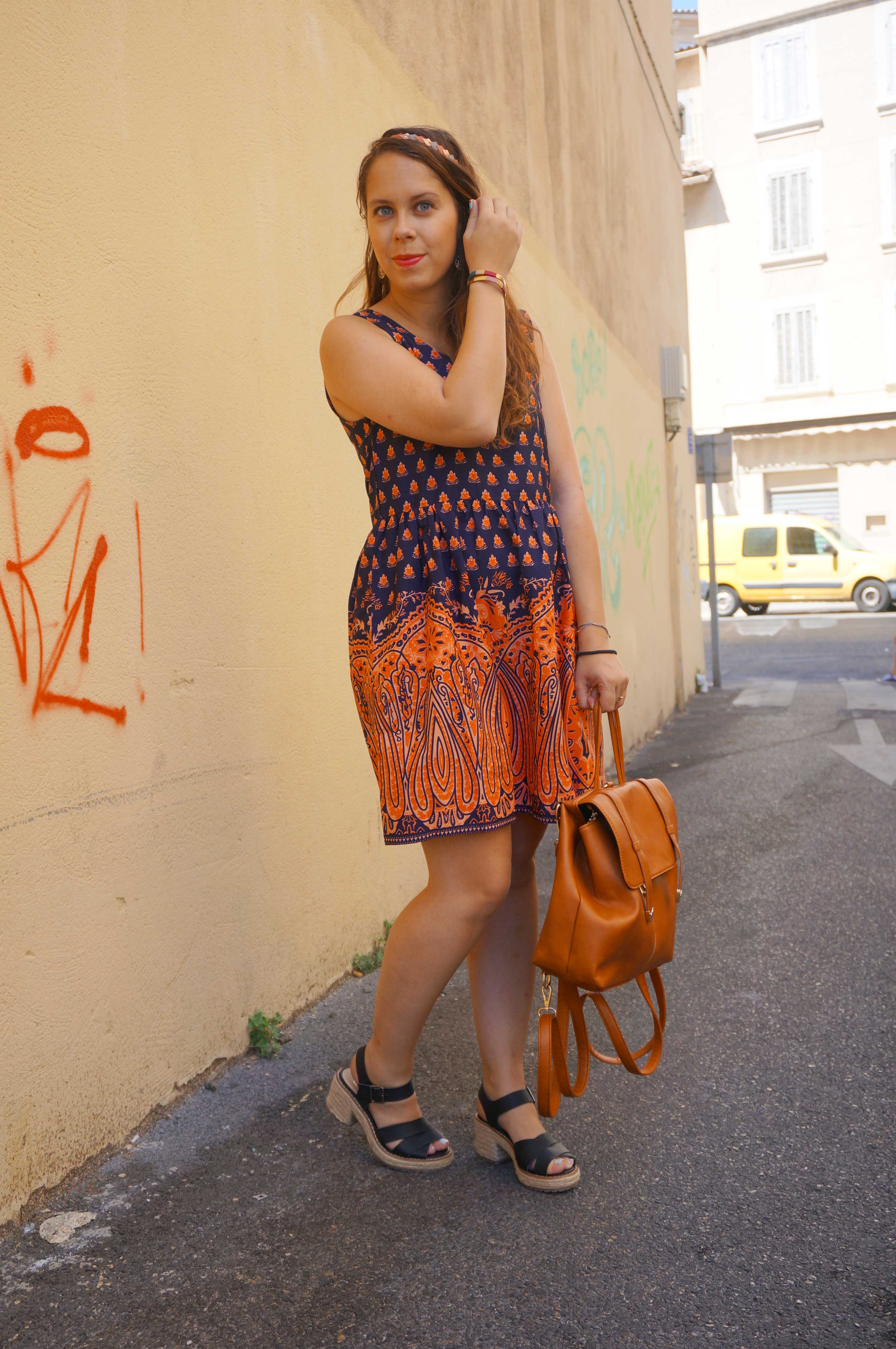 J’aime vraiment beaucoup tes sandales le talon en paille rend super :) Les motifs de la robe sont très jolies et j’ai à peu près le même sac à dos acheté chez stradivarius l’année dernière ^^