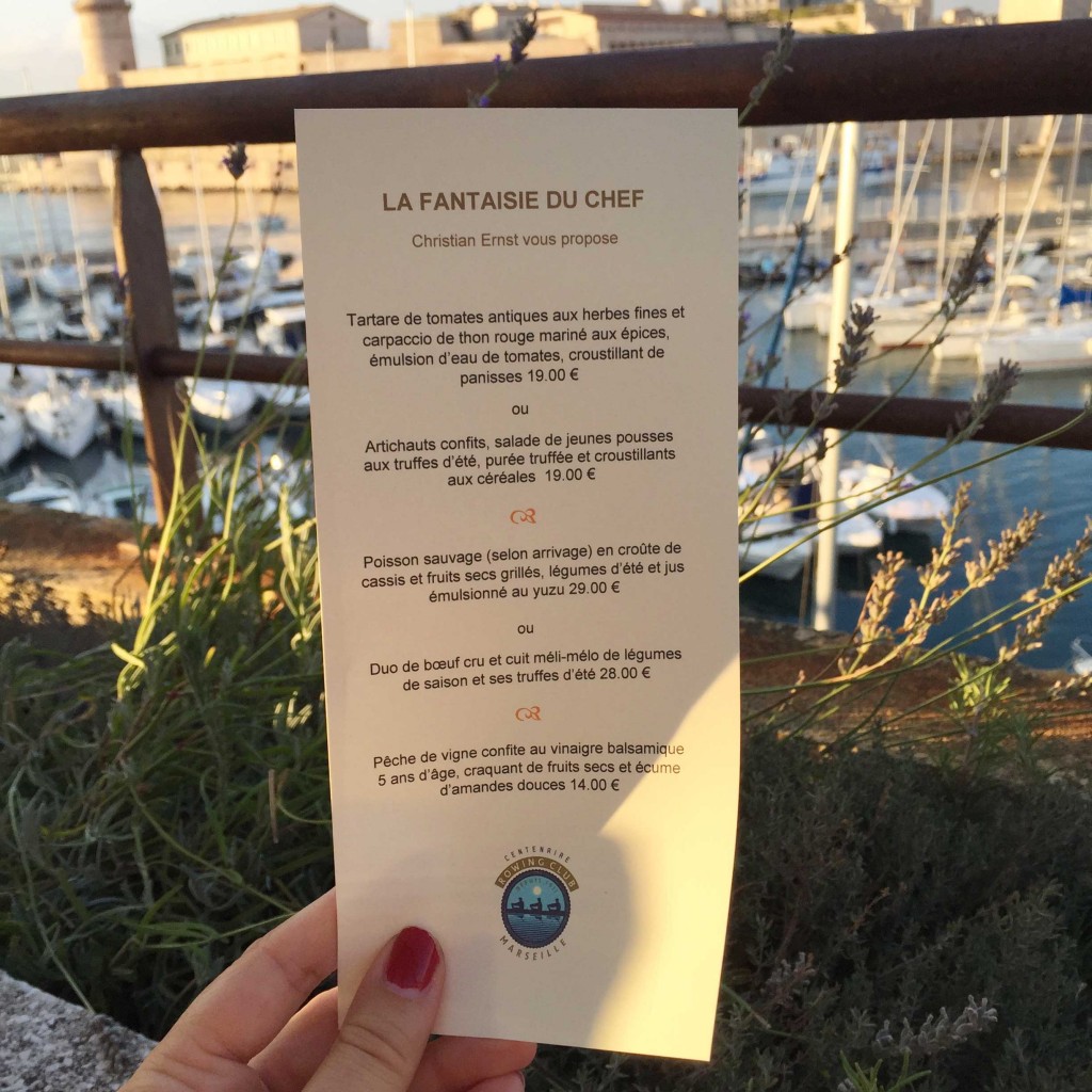 Dans le cadre des Tables Maille, j’ai donc pu goûter la cuisine du Chef Christian Ernst, et le moins que l’on puisse dire, c’est que je me suis régalée ! Par contre, si vous n’aimez pas le poisson, ça ne risque pas trop de vous plaire (je préviens ! ^^). Pour ma part, j’ai plutôt opté pour de la viande au lieu du poisson en plat principal, mais j’ai goûté dans l’assiette du Dandy Marseillais et c’était super bon ;) Alors, prêts à découvrir ce menu d’exception ?