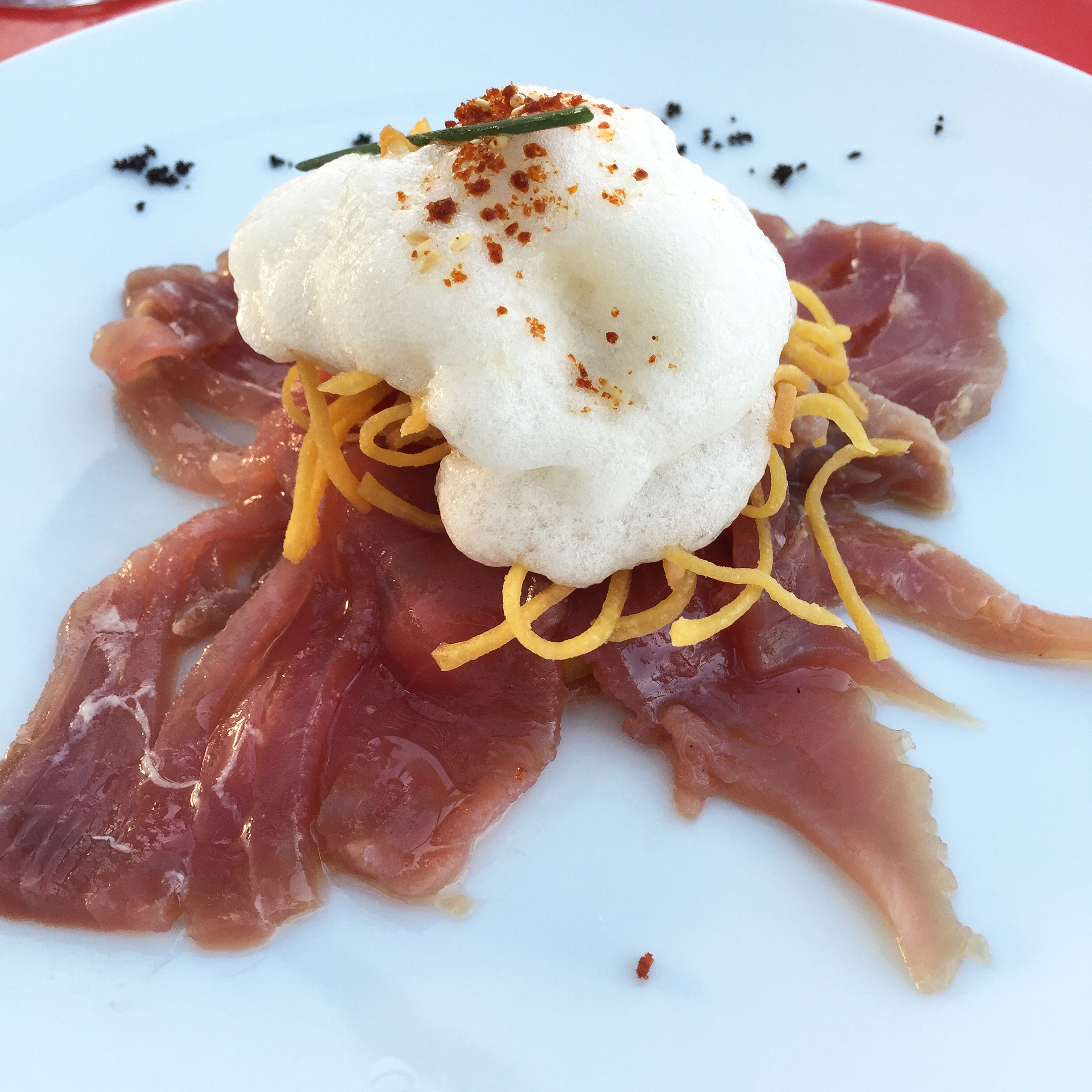 En entrée, nous avons dégusté un tartare de tomates antiques (cachées sous une émulsion d’eau de tomate) accompagné d’un carpaccio de thon rouge mariné aux épices, avec des croustillants de panisse. Depuis quelques mois, je me suis mise à manger du poisson cru (merci les sushis !) et du coup, j’ai adoré cette entrée ! Le mélange des saveurs, la truffe, les épices… tout se complète à merveille pour former une entrée très complète et fraiche !