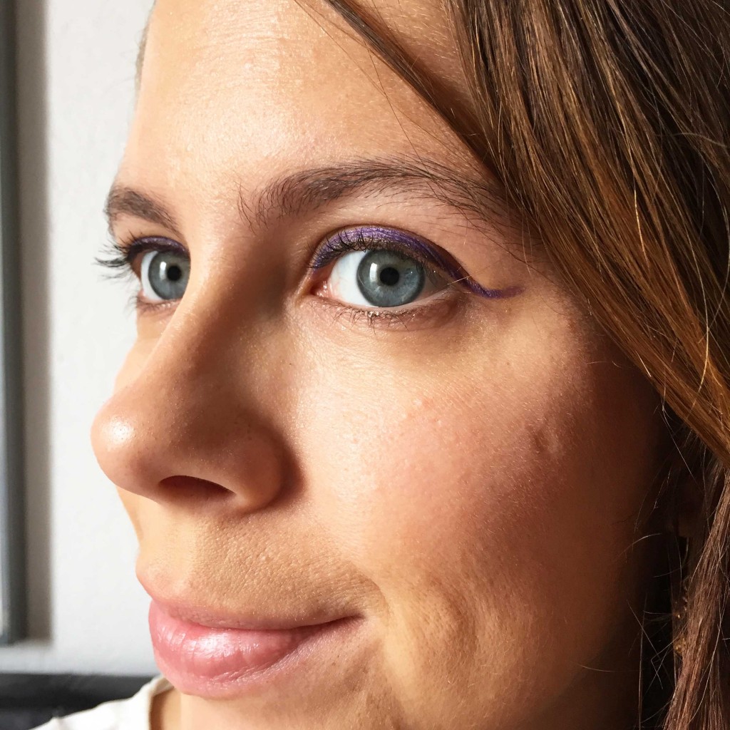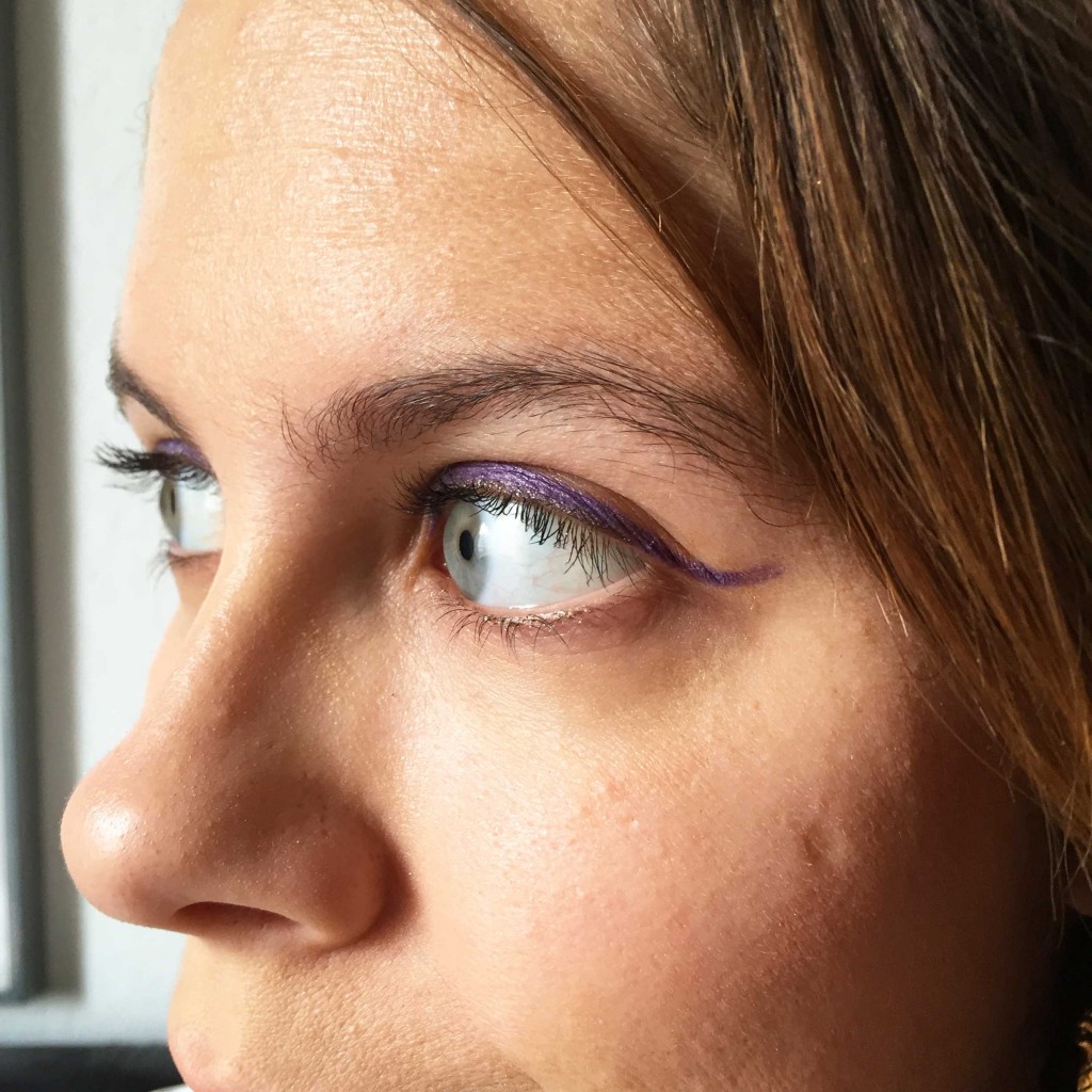 Pour ma part, j’ai opté pour l’eye-liner n°05 “Violet Iris” que j’ai appliqué tout au long de ma paupière, en débordant sous forme de virgule à l’extérieur de la paupière supérieure. J’ai ensuite pris l’eye-liner n°03 “Brun écorce”, avec ses paillettes dorées, pour ajouter une petite touche d’éclat à mon trait. Je l’ai appliqué au ras de la paupière supérieure. Et voilà le travail : un regard de biche original, à réserver pour les sorties entre amies sur le rooftop des Terrasses !