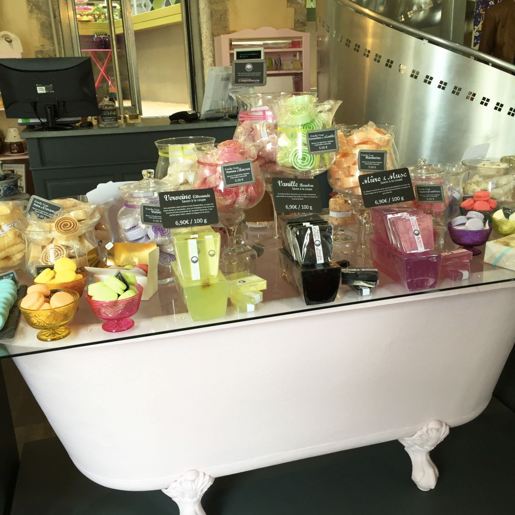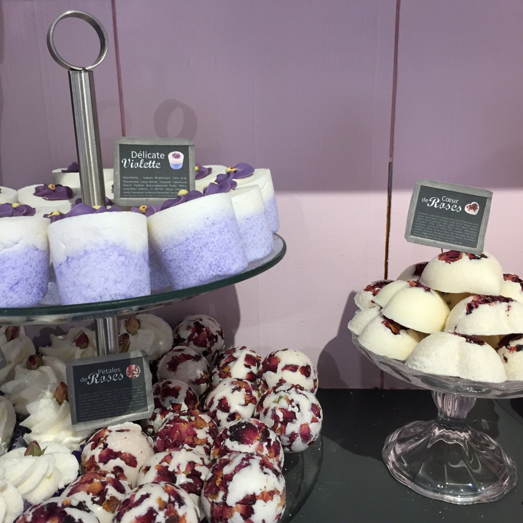 Dès que l’on rentre dans la boutique, on se sent tout de suite chez soi. Sûrement grâce à l’accueil chaleureux de l’équipe de la boutique, mais aussi grâce au mobilier girly chiné un peu partout. Dans une ambiance rose et grise, tout est fait pour nous rappeler que malgré ses airs gourmands, la boutique est en fait dédiée aux cosmétiques. Au centre du magasin, une baignoire girly donne le ton ! Et je dois dire, j’aimerai bien avoir la même à la maison pour pouvoir utiliser certains produits vendus chez Bain de Gourmandises.
