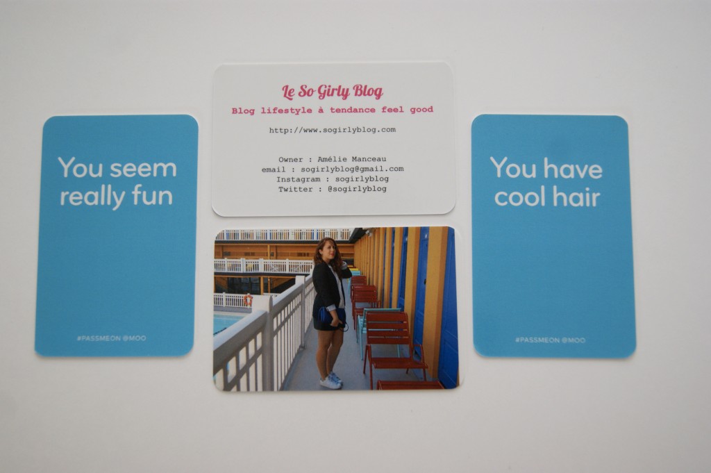 - Mes cartes de visite MOO font toujours leur petit effet. Du papier de qualité, la possibilité de les personnaliser avec mes photos de blog ou mes photos Instagram, des cartes originales… A chaque fois, la même réaction : « Wow ! »