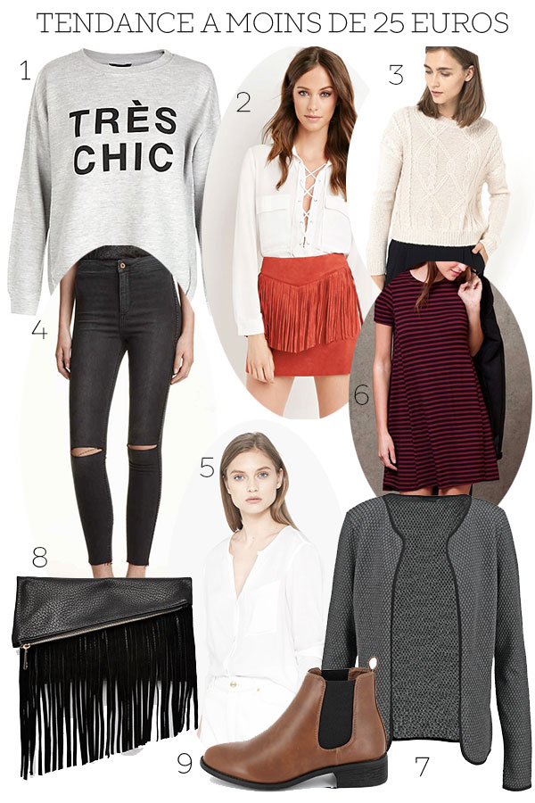 Je me suis donc permise de vous concocter une sélection shopping moins de 25 euros avec des vêtements et des accessoires qui vont faire de vous une véritable fashionista, sans vous fâcher avec votre banquier ! Alors… Prêtes à craquer ? Parce que moi je sens que je vais me faire une petite commande shopping virtuel à mon retour de vacances ;)