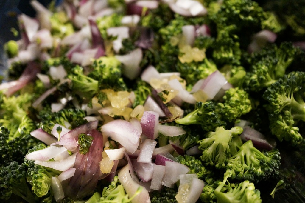 Pendant que le brocoli marine (pourtant c’est vert… non ? —-> OK JE SORS !), épluchez le demi-oignon et coupez le en petits morceaux. Si vous avez de la menthe fraiche et de l’ail à la maison, hachez les et mélangez les sur le brocoli. Si comme moi vous n’en aviez pas, j’ai toujours dans mon congélateur les petites boites d’aromates Picard qui sont tops et qui dépannent bien ! ;)