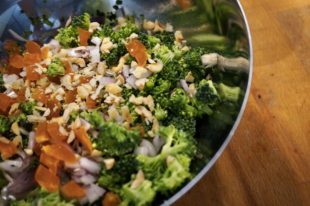 Pour donner un petit peu plus de matière dans le taboulé de brocoli, je suis allée piocher dans mon placard à snacks healthy. Dans mon bocal où je garde des fruits secs et des oléagineux, j’ai pris des abricots secs ainsi que des petites noisettes, que j’ai haché là aussi finement. Pour vous donner une idée pour deux personnes, j’ai pris 3 abricots secs et 6-7 noisettes. Ca marche aussi avec des amandes effilées si vous en avez dans vos placards ;)