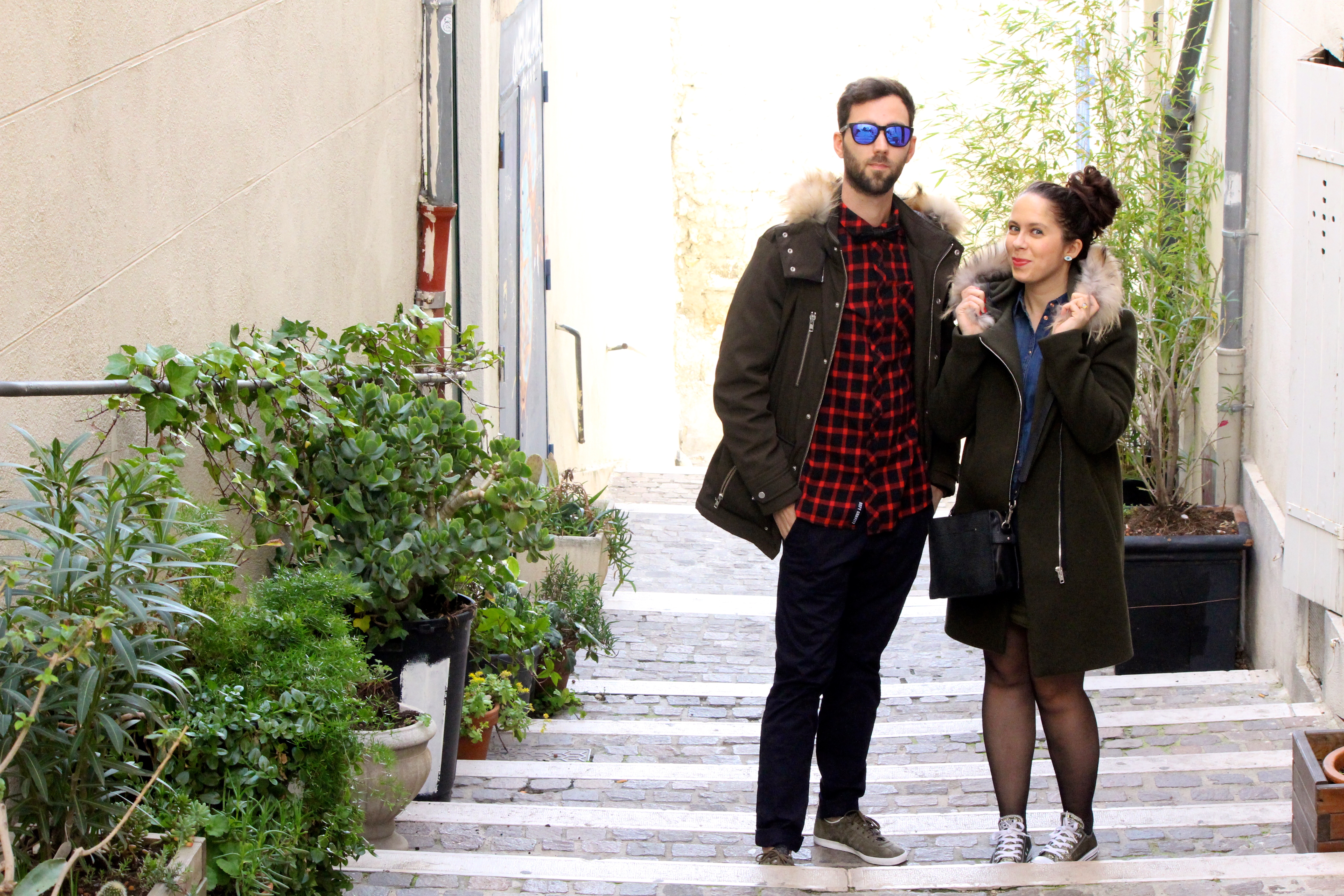Pour ce nouveau look à deux, on ne change pas nos bonnes vieilles habitudes de tenues confortables, pratiques à porter mais qui ont ce petit truc en plus qui fait toute la différence ! Malgré le beau temps, on était plutôt assortis niveau tenue, notamment avec nos manteaux kakis, trouvailles de soldes qui nous ont bien servi lors de notre séjour à Bruxelles ! ;) Le mien, je l’ai trouvé chez Sandro et c’est mon craquage de fin de soldes : un manteau long, qui ne me tasse pas trop (vive les petites tailles !!) et qui me tient bien chaud. Il faut dire qu’avant de partir en weekend en Belgique, on a écumé les magasins avec l’amoureux pour me trouver un manteau qui tienne bien chaud, car mon Sessùn adoré est top mais dès qu’il fait un peu froid ou qu’il y a du vent, c’est fichu, je suis glacée !