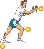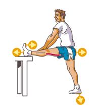 - Les mollets : pieds décalés, paume des mains appuyée contre un mur ou une barrière, jambe avant fléchie, jambe arrière tendue. On descend le talon du pied arrière vers le sol, jusqu’à ressentir une légère tension dans le mollet.