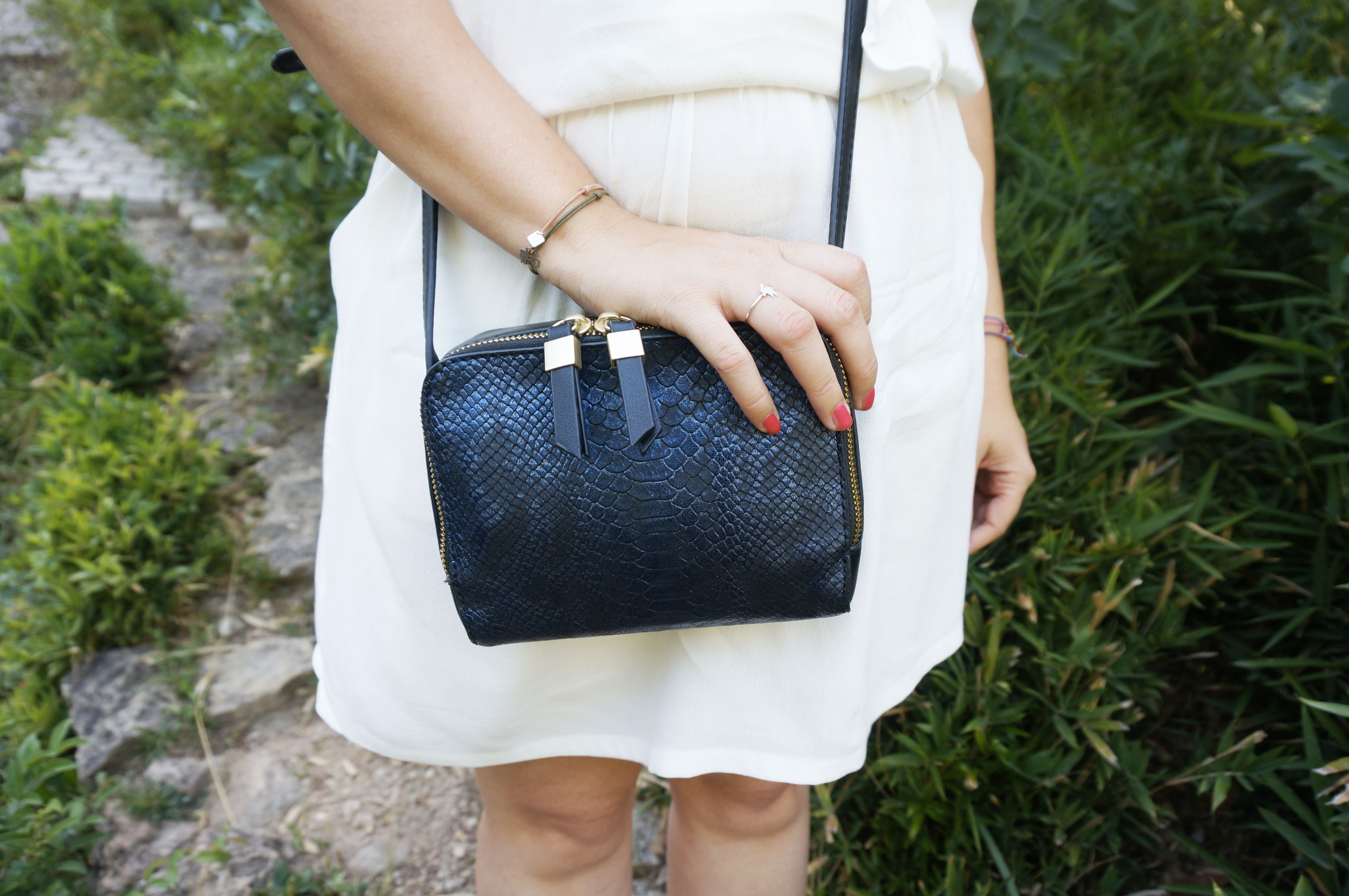 Et c’est pour des modèles imprimé python que j’ai craqué. Un imprimé un peu casse-gueule mais que j’apprécie, surtout quand il est porté avec des pièces plus classiques. Ainsi j’évite l’effet « cagole marseillaise » ;) Le sac est super pratique pour les soirées comme pour le quotidien, il a un petit côté Sandro que j’aime bien. Quand aux sandales, elles changent de ce que je peux trouver dans mon dressing, et sont assez confortables à porter, sauf quand mes pieds se mettent à gonfler. Eh oui, on ne peut pas tout le temps être glamour, que voulez vous ;)