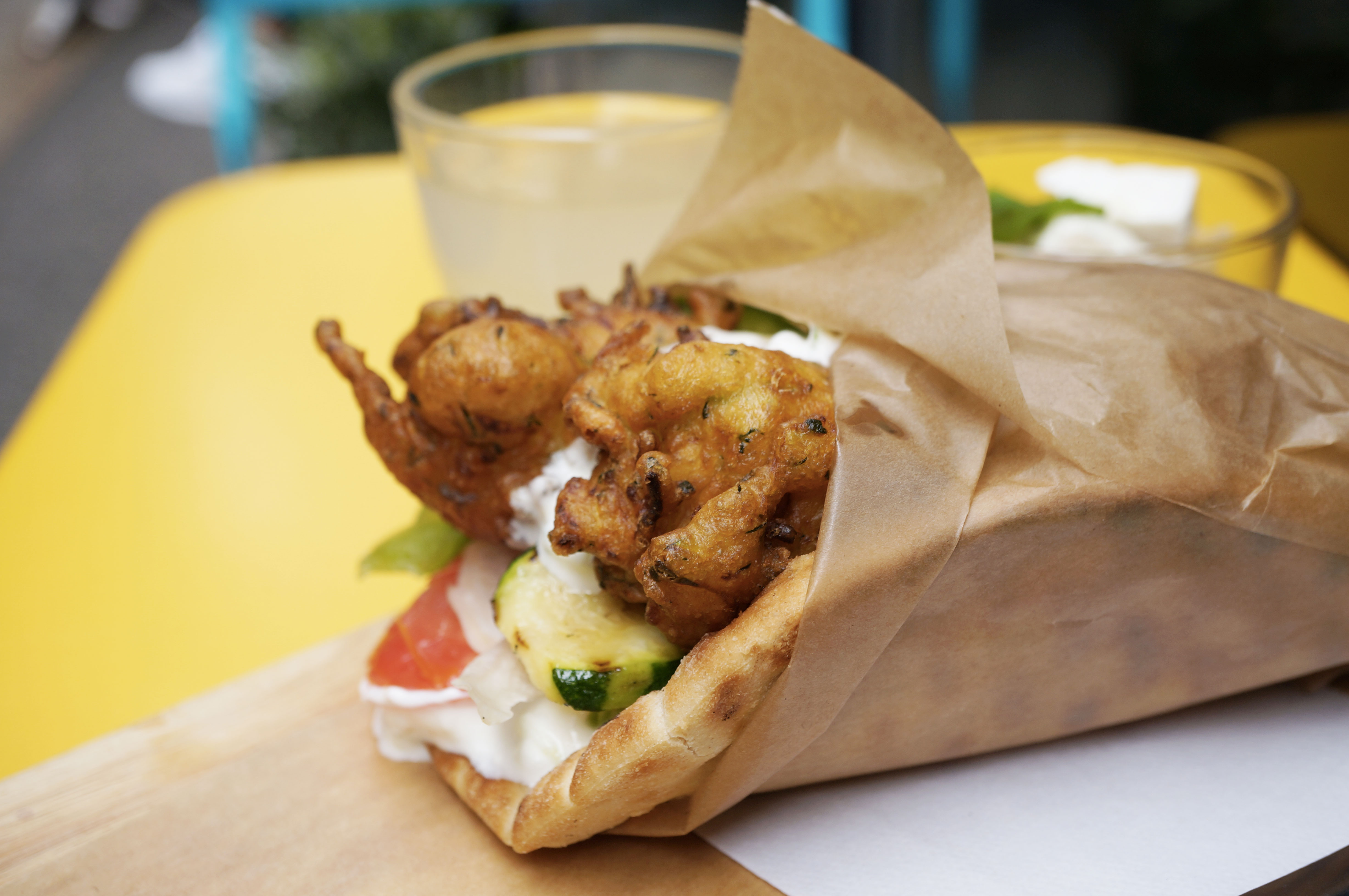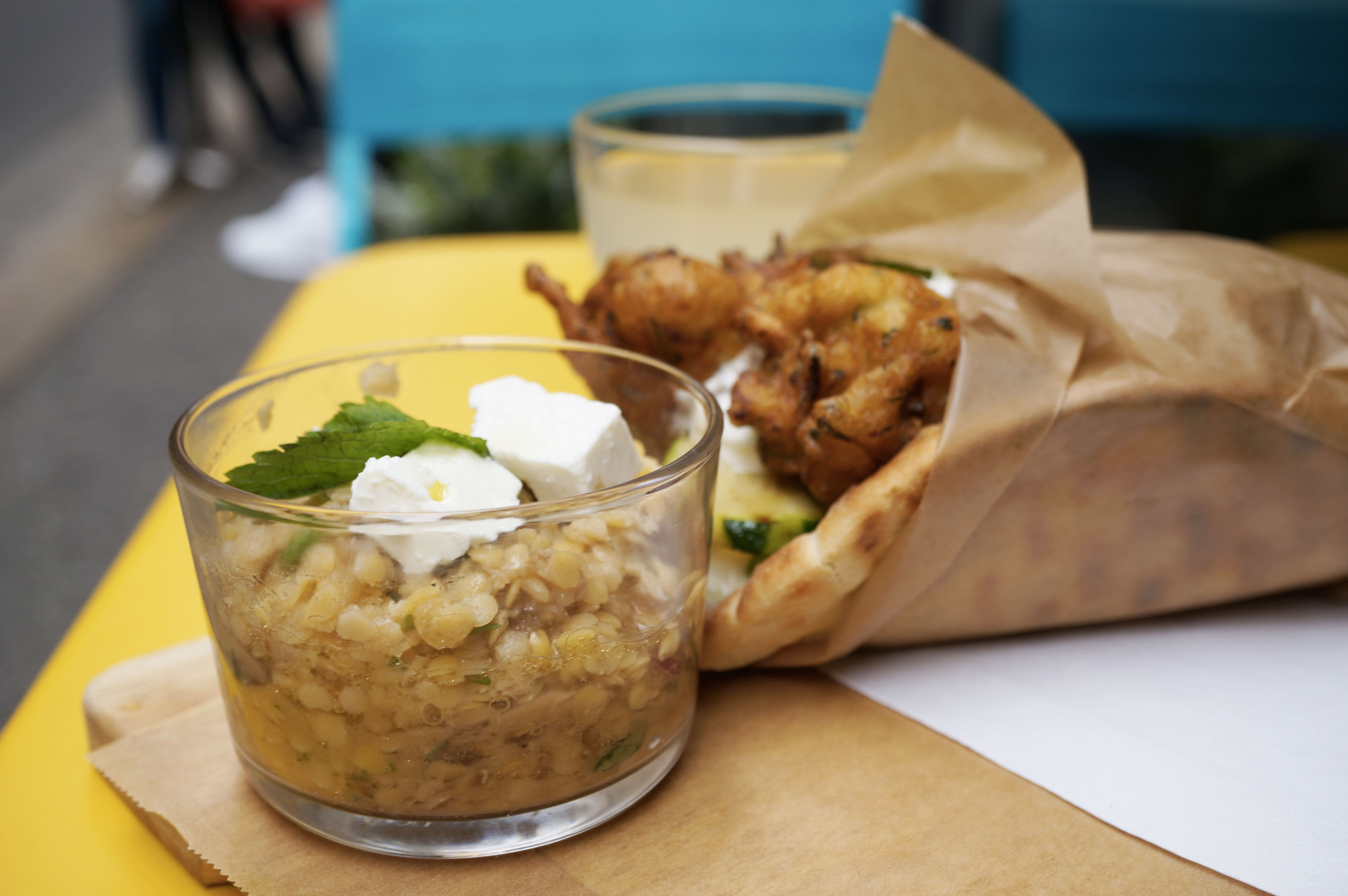 J’opte pour une pita végétarienne avec beignets de courgette, légumes grillés, sauce tatziki maison et accompagnée d’une délicieuse salade de lentilles blondes froide. Un plat très copieux entre nous, tellement que je n’ai pas réussi à finir la pita qui est généreusement garnie !