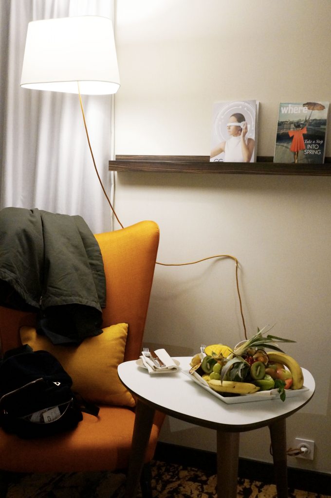 Fraichement rénové, le Radisson Blu Paris Boulogne est du coup plutôt bien situé. On nous a résevé une chouette chambre Business, à la décoration moderne et chaleureuse. 2 gros lits moelleux nous attendent, et on a vraiment hâte de pouvoir s’écrouler dedans avec la fatigue accumulée ces dernières semaines ! D’autres surprises nous attendent dans la chambre : une immense corbeille de fruits mais aussi des chocolats. De quoi passer un bon séjour ! ;)