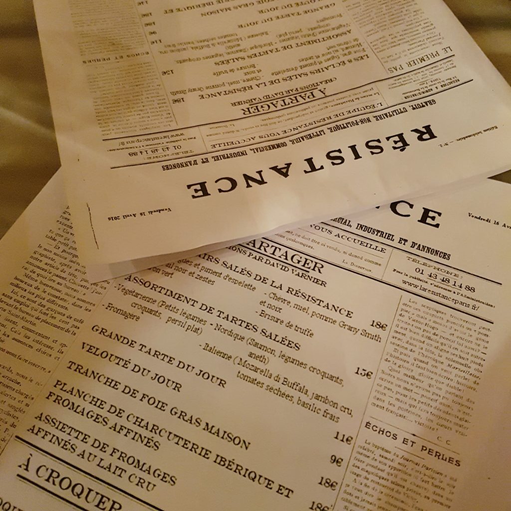 Le soir, nous sommes rejoints par des amis, et on part dans le Marais pour boire des cocktails et grignoter des tapas. On finit par dénicher un petit lieu très sympa, intitulé La Résistance. Une ambiance feutrée, des cocktails et du bon vin, des planches de fromage et de charcuterie à partager… Bref, on passe une excellente soirée ! :)