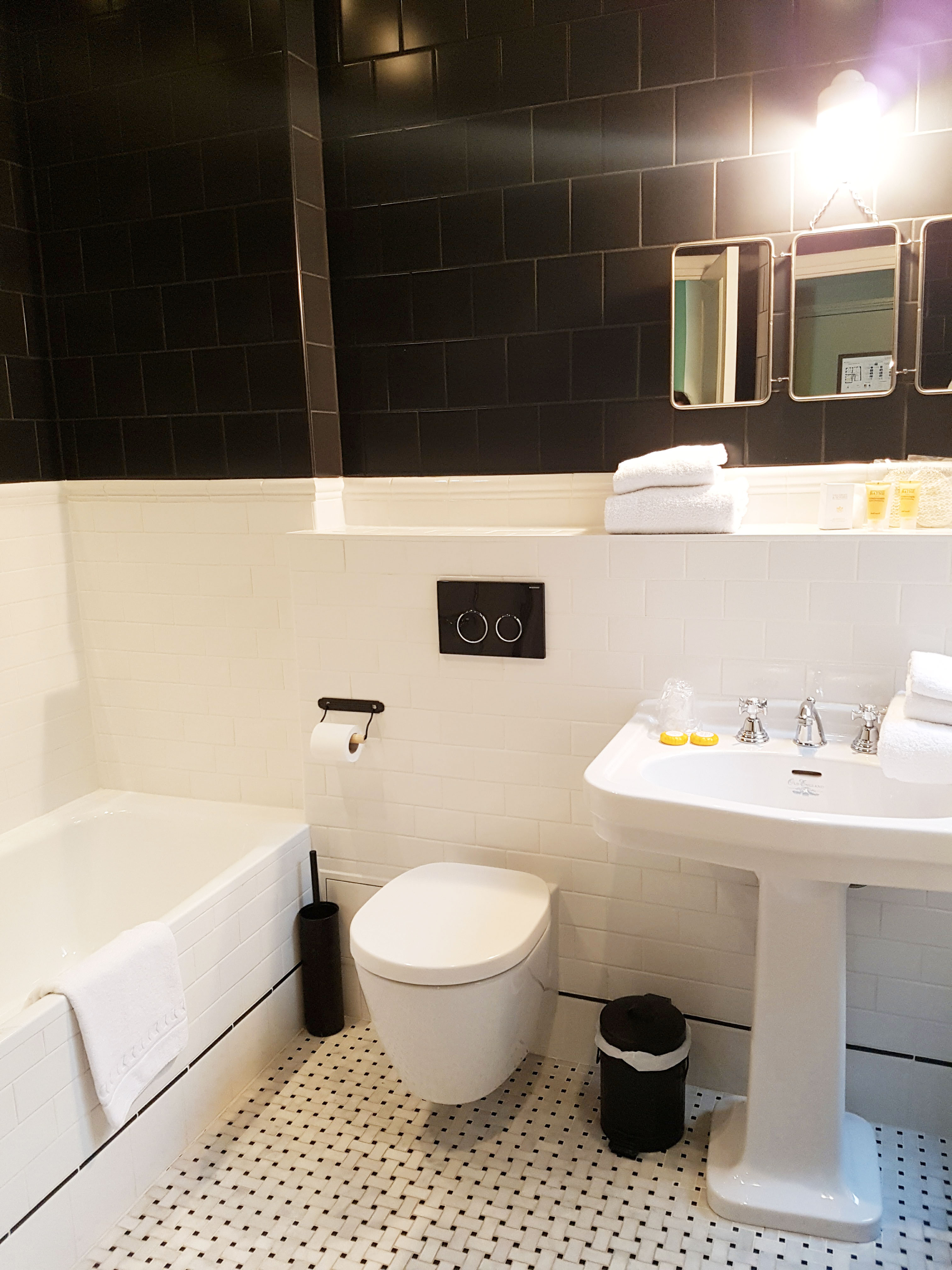 Une fois arrivés, nous avons posés nos valises et eu un vrai coup de coeur pour la chambre. Il faut dire que son lit majestueux (et immense ! On aurait pu dormir à 4 dedans haha) y est pour beaucoup. Les couleurs et la salle de bains très 1900 ne font qu’accentuer mon coup de coeur.
