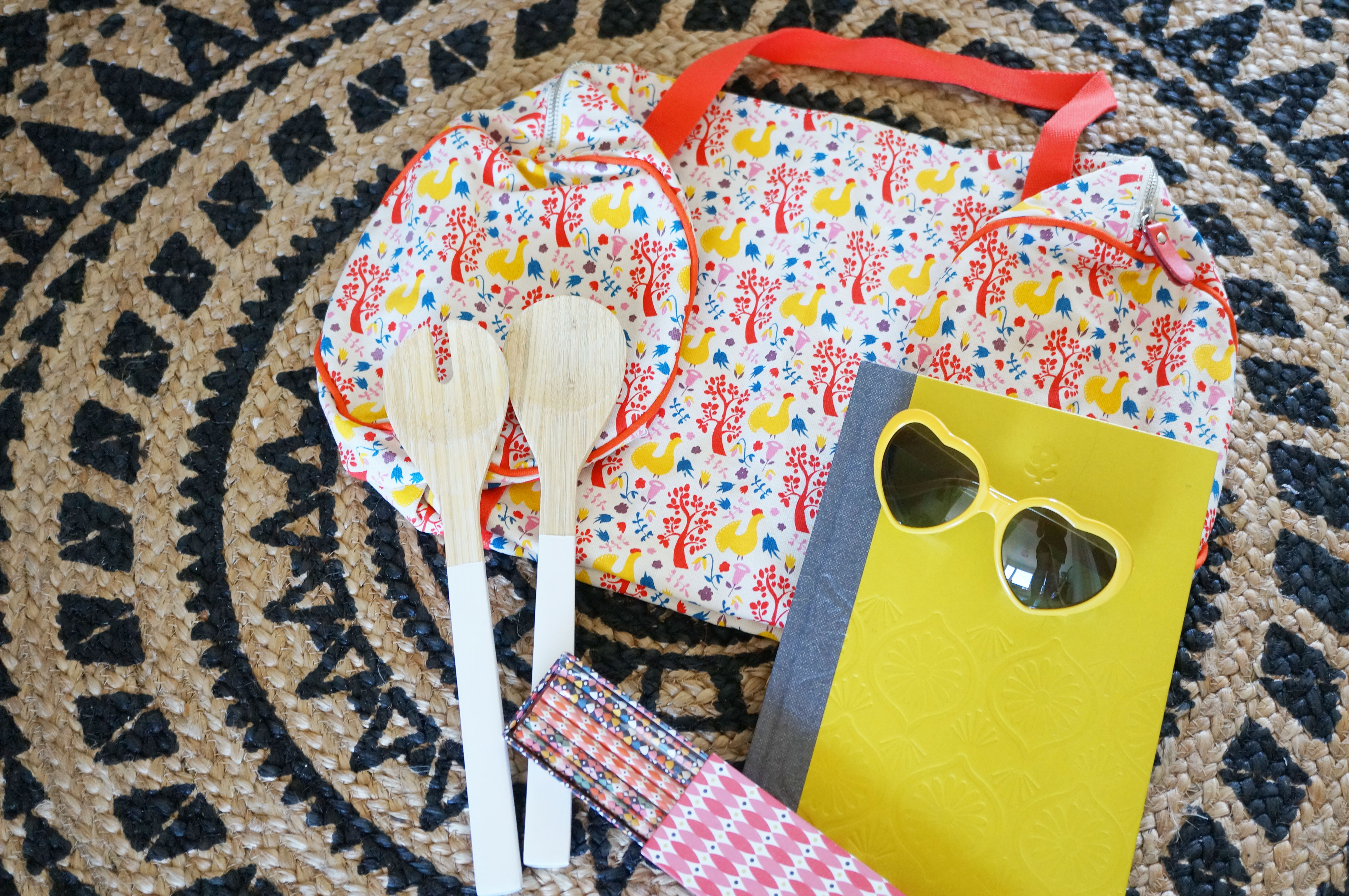 A l’intérieur, vous retrouverez notamment des lunettes de soleil, des couverts à salade en bois, un joli sac bowling imprimé et bien d’autres surprises ! ;)