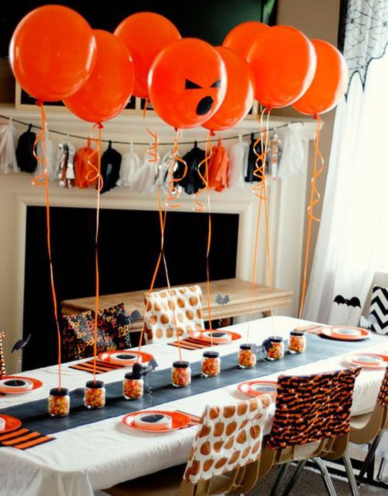 Si jamais vous avez décidé d’organiser une petite fête pour Halloween pour vos enfants, voici une décoration de table simple mais qui fera son effet ;) Des petits pots dans lesquels vous glisserez des bonbons, des ballons oranges décorés avec des empiècements en gros scotch noir pour former des visages, et quelques assiettes en carton oranges, et le tour est joué ! :)