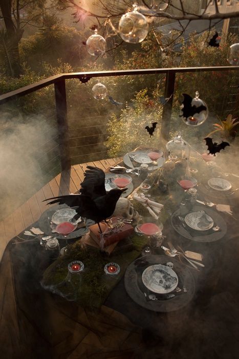 Pour une ambiance lugubre à souhait, optez pour cette décoration digne d’un roman fantastique ! De la mousse en guise de chemin de table, de la vaisselle noire et à imprimé gothique, des fausses chauve-souris et corbeaux en carton épais noir… De vieux grimoires, des crânes en plastique… Bref, vous allez mettre le paquet pour cette table au décor très chargé mais très réussi !