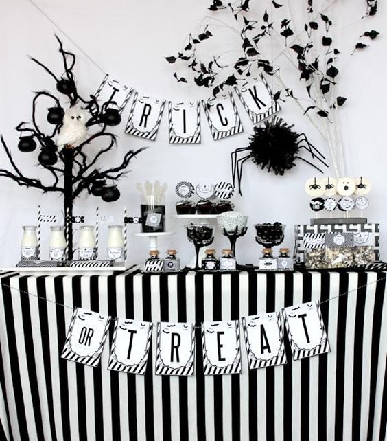 Si vous avez envie de proposer un buffet de gourmandises à vos invités, pourquoi ne pas opter pour une Sweet Table avec une décoration chic mais pile dans le thème d’Halloween ? Cette Sweet Table tout en noir et blanc devrait faire son petit effet sur vos convives ;)