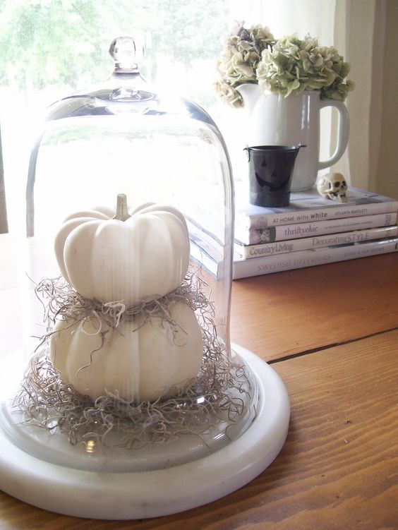 Comme c’est la grande tendance des cloches en verre en ce moment dans les magasins de décoration, vous pouvez en profiter pour glisser quelques citrouilles et guirlandes fines lumineuses.