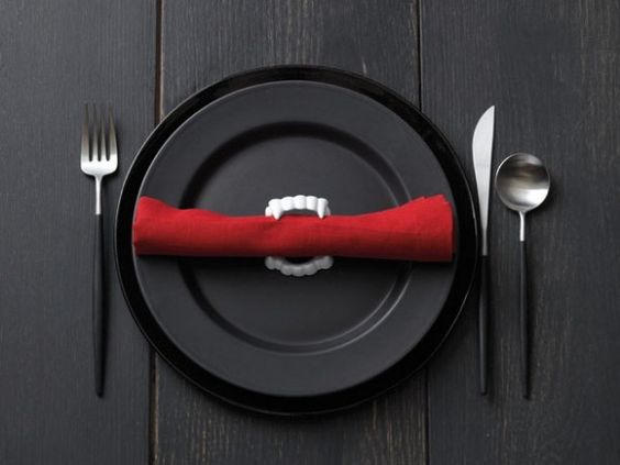 Vous avez décidé de jouer la carte de l’horreur à table ? Et si vous invitiez vos convives à diner à la table de Dracula… ? Pour cela, rien de plus simple : il vous suffit d’acheter des serviettes de table rouges ainsi que des dentiers de vampire. Et voilà une déco effrayante mais simple comme bonjour ! :)