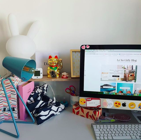 J’ai un bureau qui fait un peu plus d’1m de large, un bureau scandinave acheté une centaine d’euros chez Conforama il y a 2 ans environ. Dessus, on retrouve quelques produits essentiels : des petites boites de rangement, une lampe qui vient de chez La Chaise Longue, un pot à crayons crée à partir d’un énième mug reçu en soirée blog et aussi quelques petits bibelots de décoration, qui sont un peu comme des doudous. Mes chats chinois notamment, dont le gros qui est un cadeau de l’amoureux :)