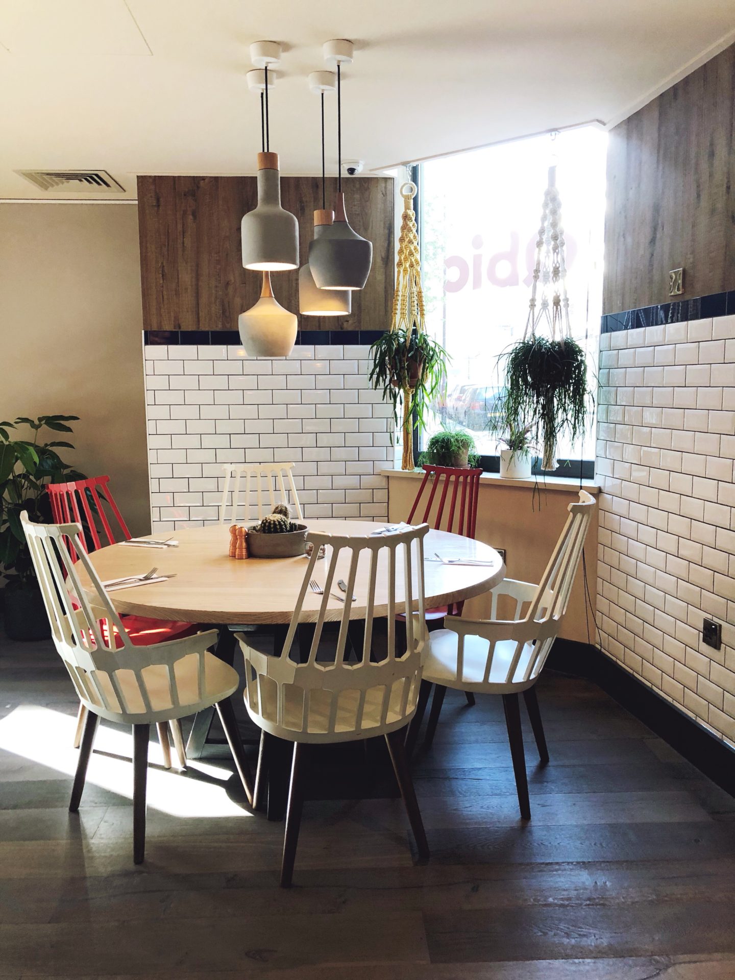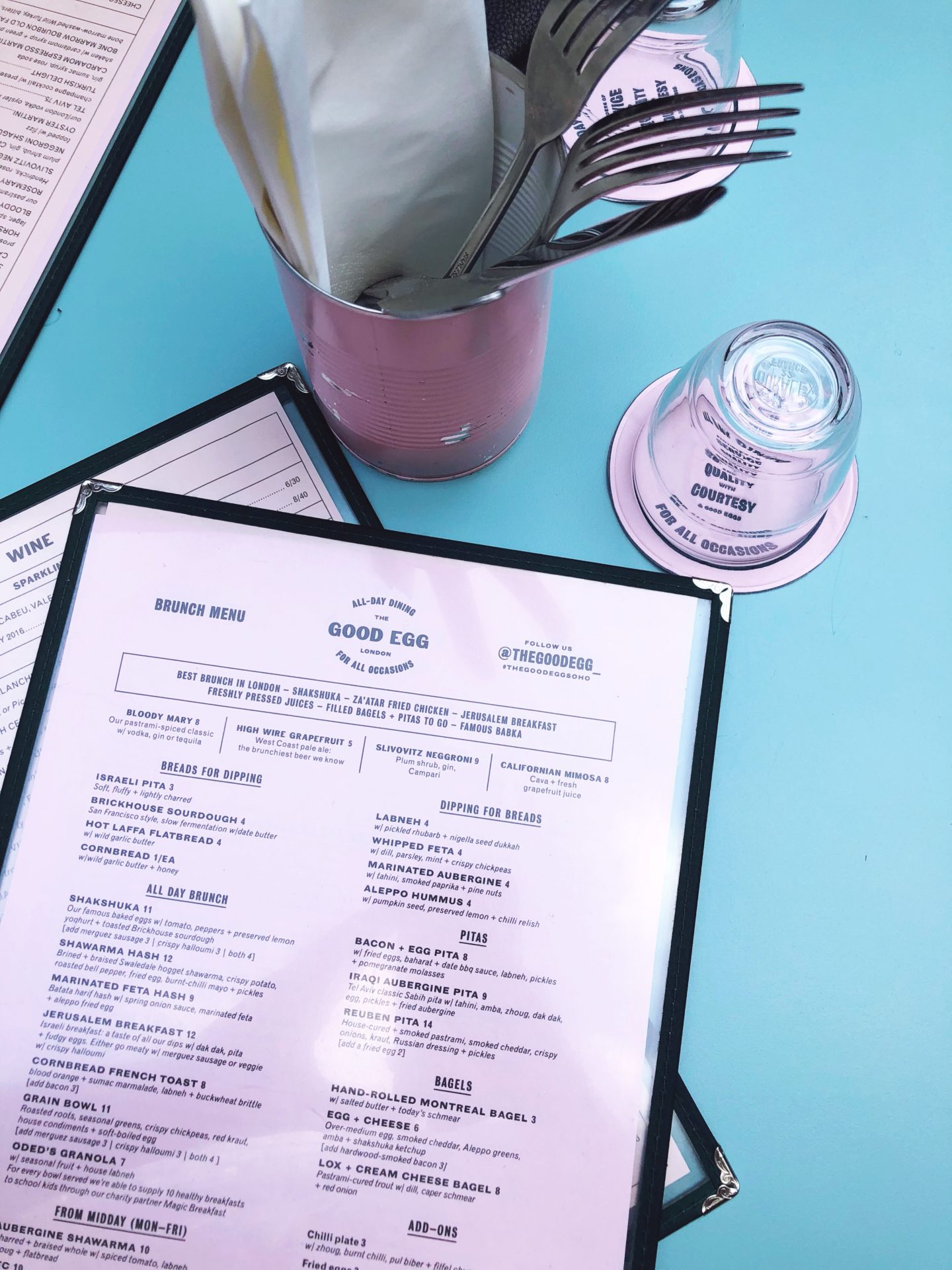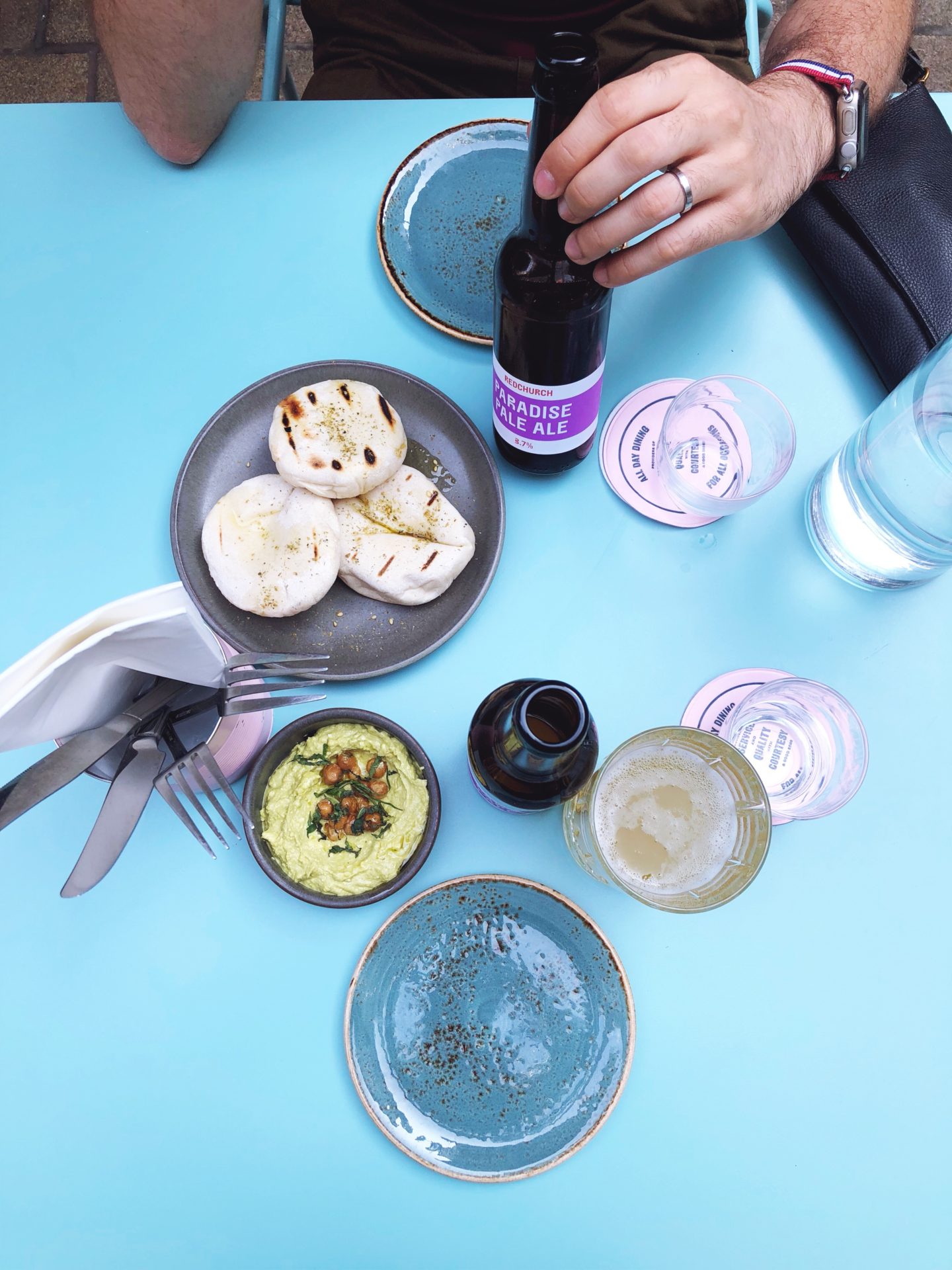 Toujours du côté de Kingly Court, mais en bas cette fois-ci ! Confortablement installés en terrasses sous de grands parasols, j’ai tout d’abord craqué pour la déco, dans des teintes roses et mint. Complètement girly ! On y déguste une cuisine d’inspiration israélienne mais nous y avons surtout fait l’apéro ! Au menu : bières, du pain pita à tomber par terre et un mélange fêta avec des légumes verts délicieux !