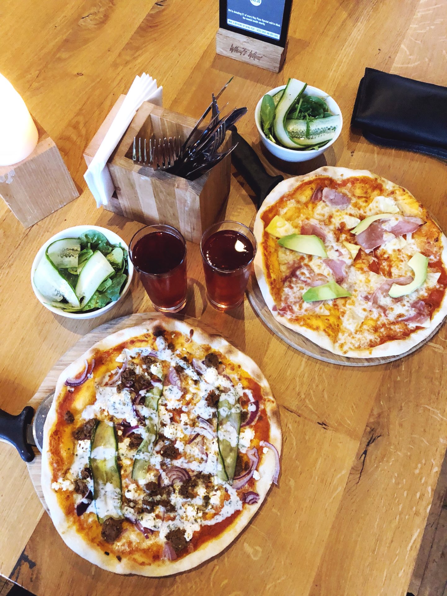 Ils ont plusieurs restaurants partout en Grande-Bretagne et pour le coup, c’est un concept très sympa ! Il y a souvent des concerts et le mardi, ils proposent le Tuck-In Tuesday, dont nous avons profité : pour £10, vous avez une pizza au choix + une salade + un demi de cidre ou de bière !