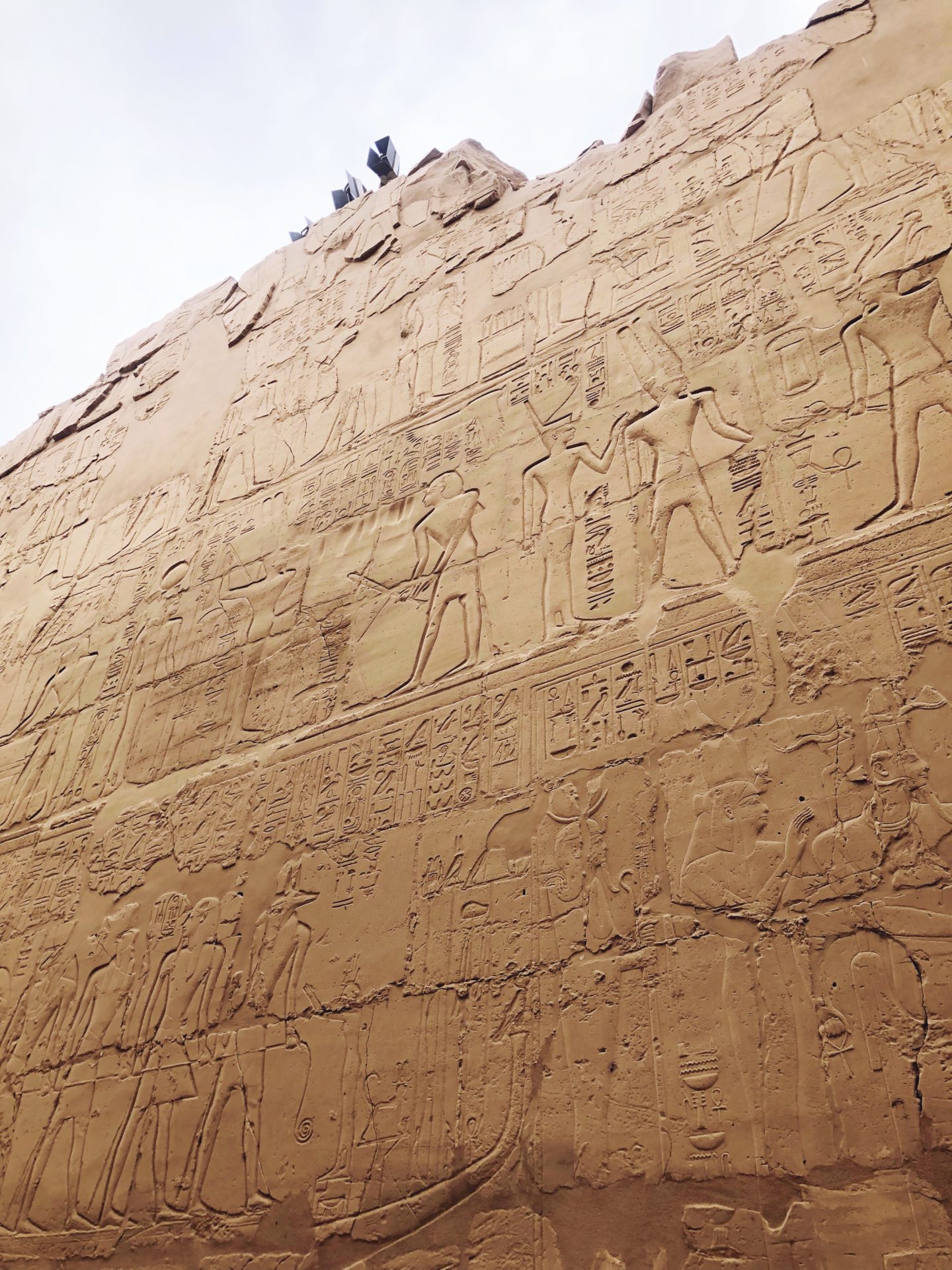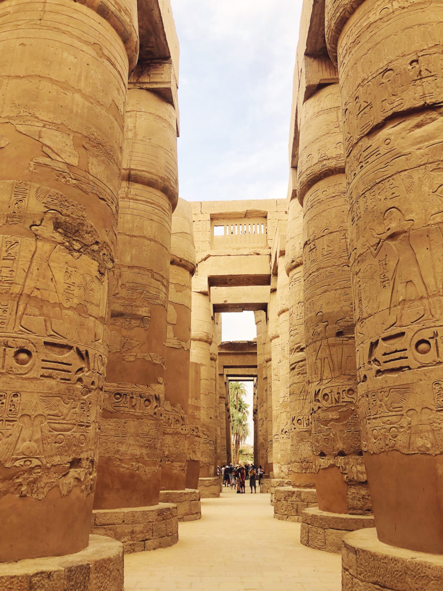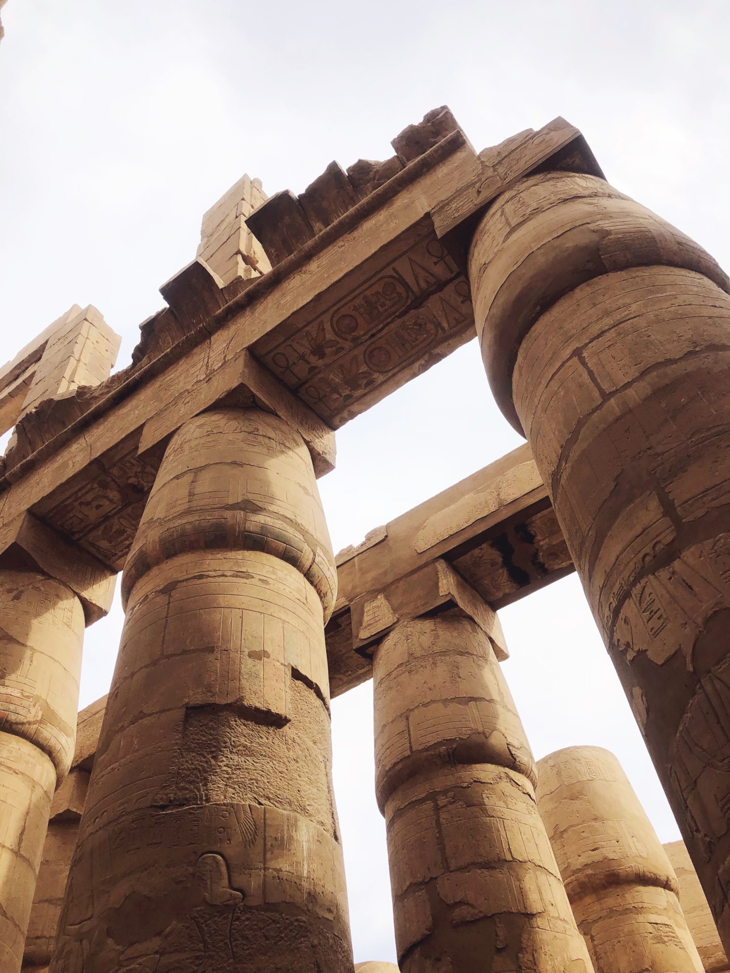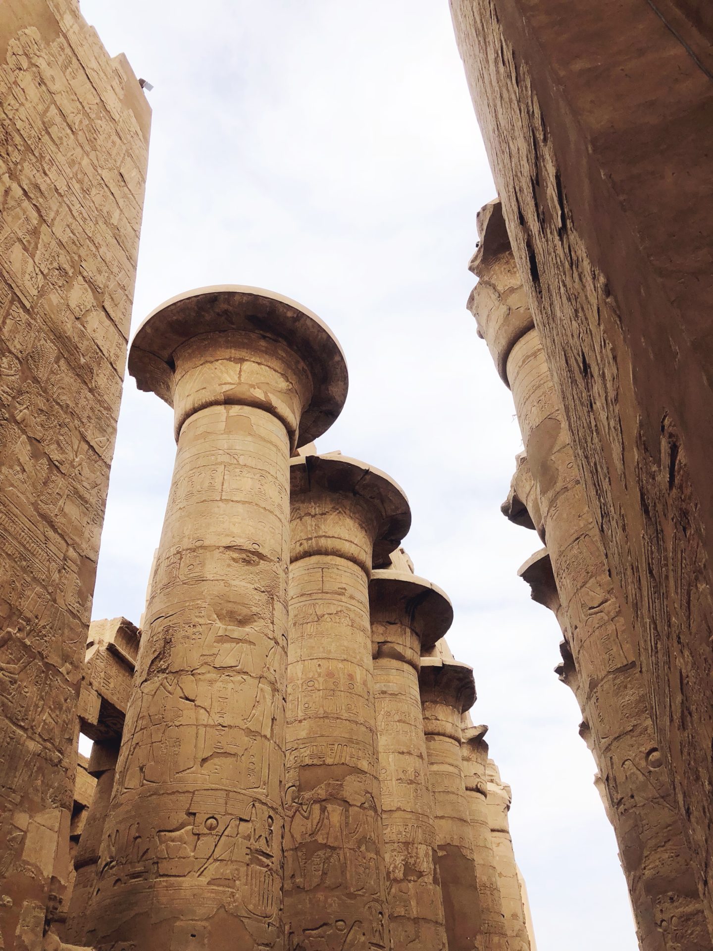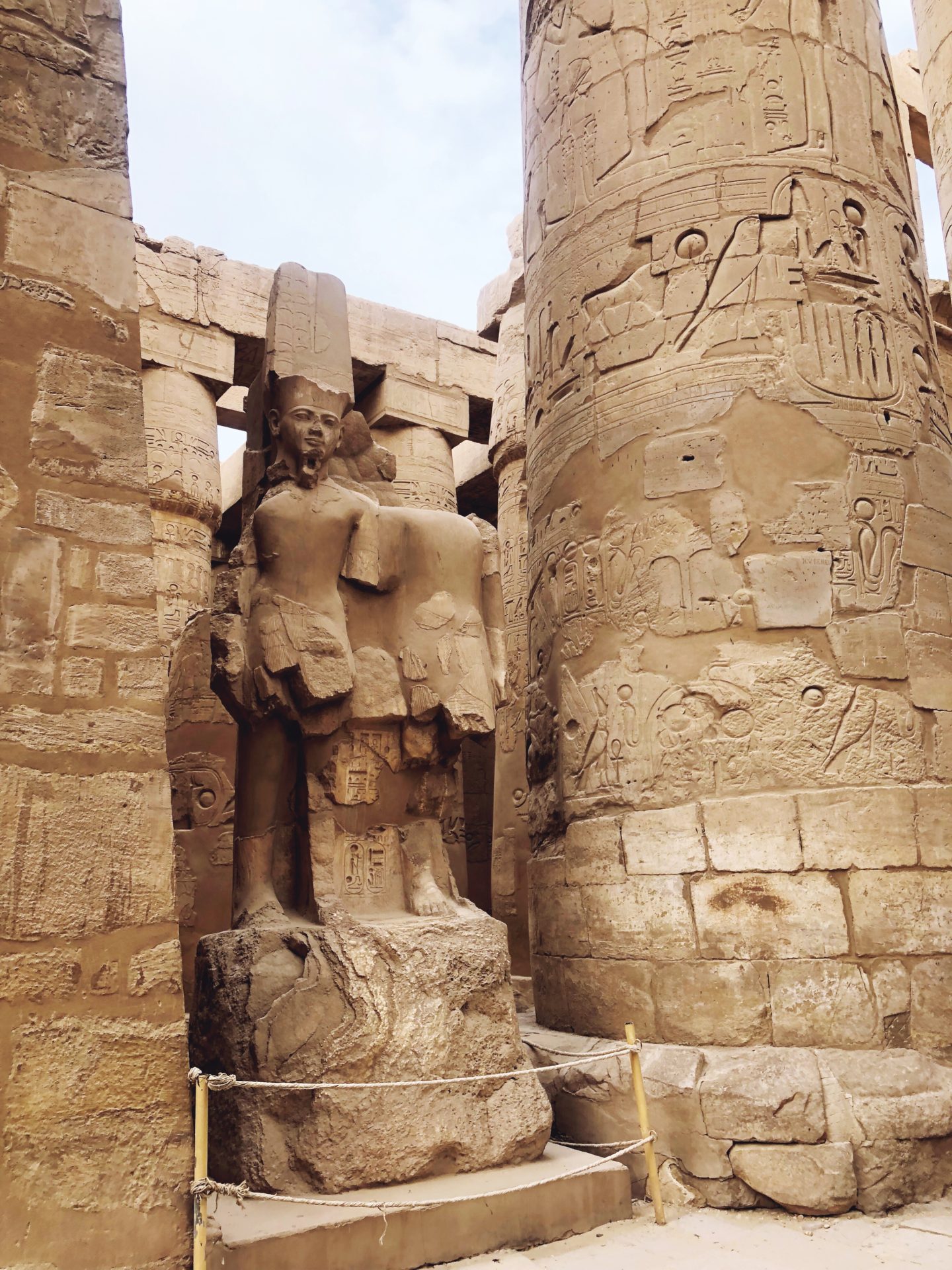 La partie la plus connue du temple – et celle qui en met clairement plein les yeux – est une salle dans laquelle se trouvent une centaine de colonnes, la plupart étant tout de même relativement bien conservées. En levant les yeux, on peut même encore apercevoir certaines couleurs du temple, puisque tous ces monuments étaient à l’origine peints dans des couleurs vives. Mais le temps, les intempéries mais aussi le soleil ont fait disparaitre petit à petit ces sublimes couleurs…