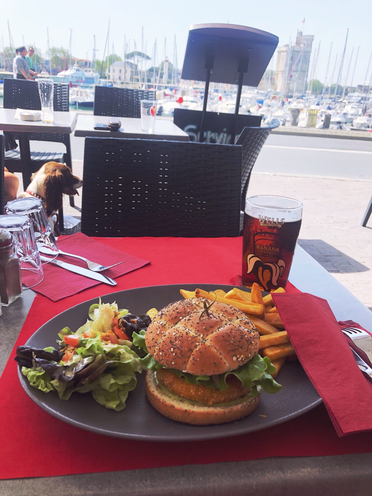 Je travaille pendant la mâtinée, et le midi je rejoins une copine pour déjeuner en terrasse sur le port. Ce sera bière à la banane & hamburger végétarien !