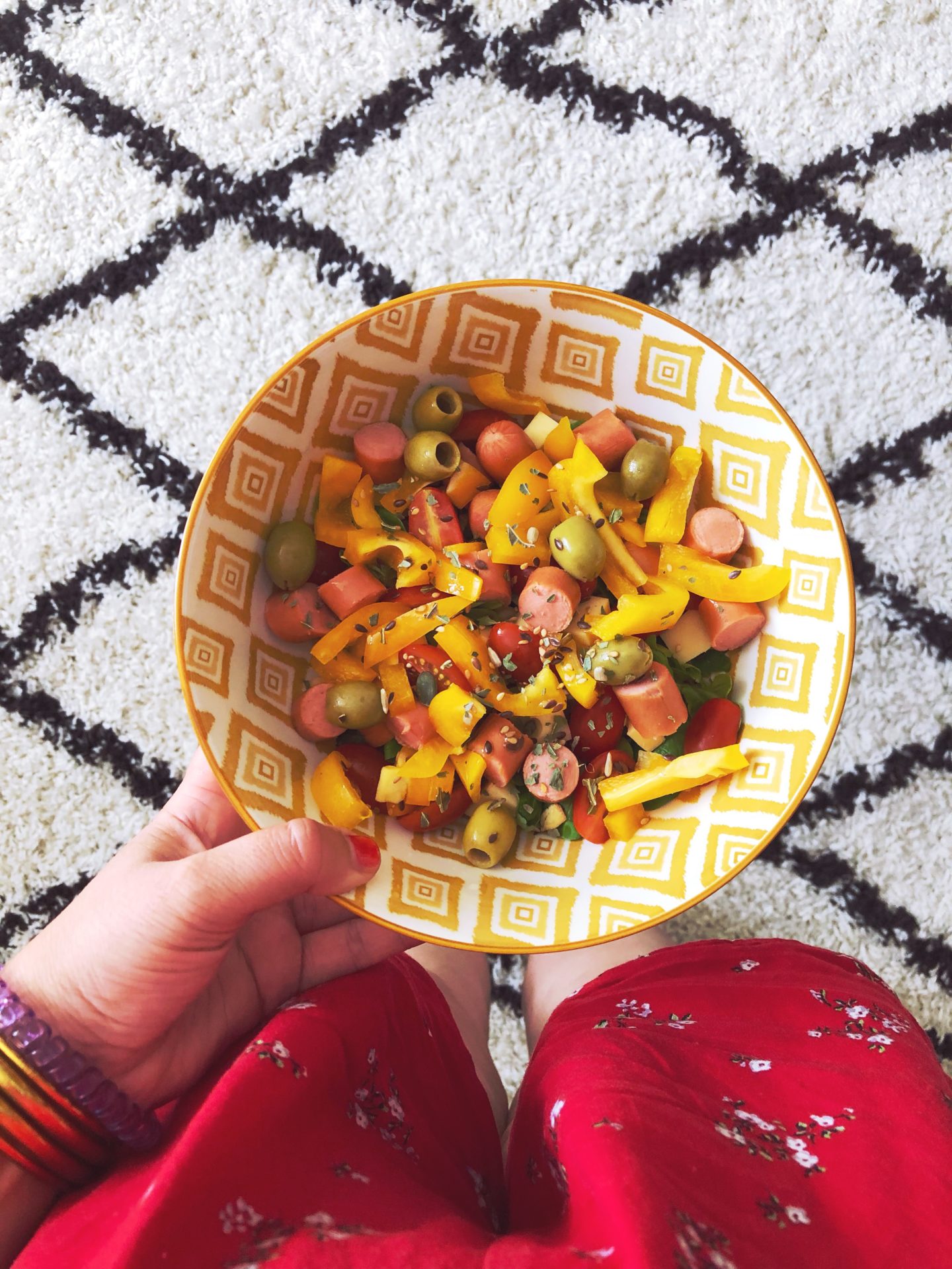 Le soir, je me cuisine une salade de pâtes, avec du concombre, des tomates cerises et un peu de coppa.