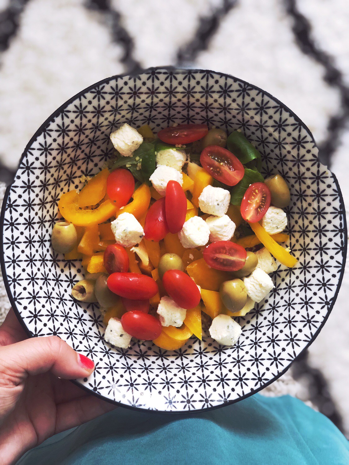 Le soir, j’ai un peu la flemme de cuisiner. Je me concocte donc un plateau TV avec du concombre, une mini salade et un fromage de chèvre avec de l’huile d’olive et du basilic :)