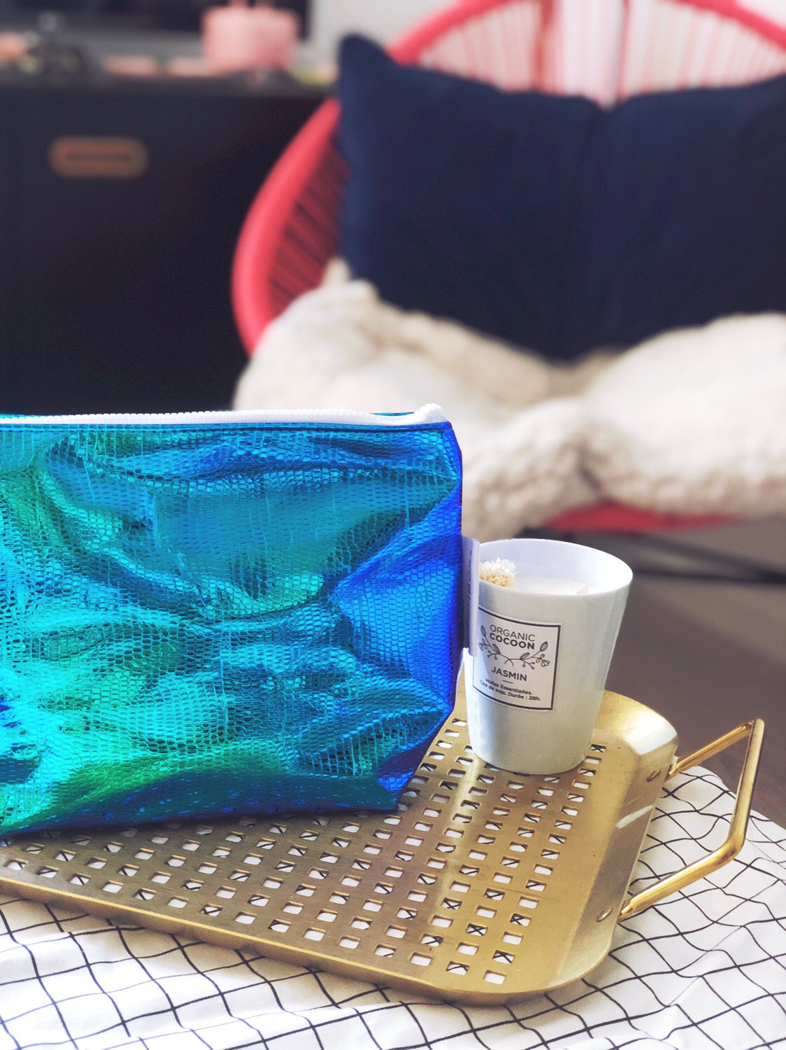 Joliment rangés dans une belle trousse à maquillage ou pochette mermaid (qui va me suivre partout lors de mes déplacements), on retrouve 11 produits parfaits pour l’été.