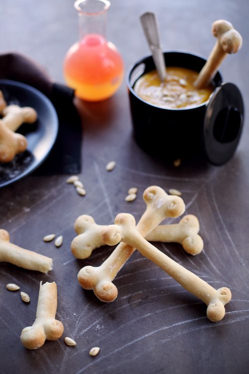 Voilà une idée sympa si vous faites un repas d’Halloween. Servez en entrée le velouté de butternut de Chef Nini, avec ses gressins en forme d’os. Vous allez vous régaler, tout en donnant le ton de la soirée !