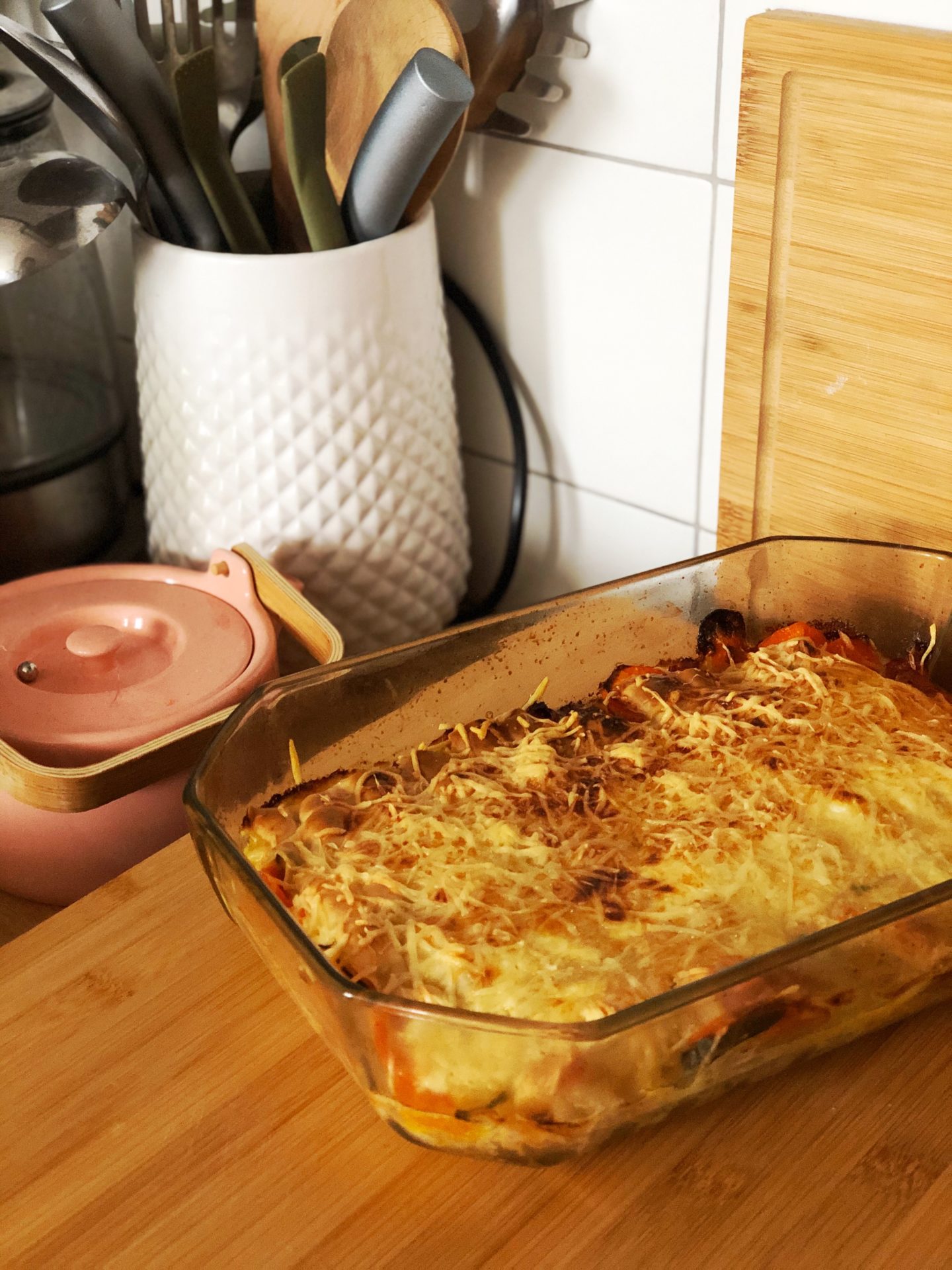 Le midi, je cuisine un gratin de ravioles aux carottes, courgettes et lardons fumés, qu’on accompagne d’un peu de salade.