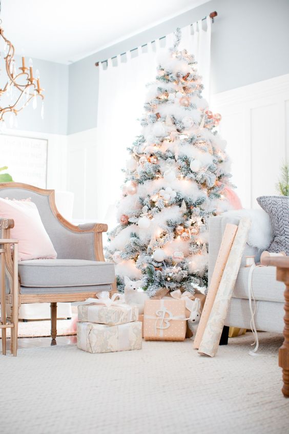 Vous avez envie de douceur en cette fin d’année ? Voici le type de décoration qu’il vous faut absolument ! Des teintes claires (rose, blanc, gris), une décoration féérique, des lumières et des matières toutes douces…