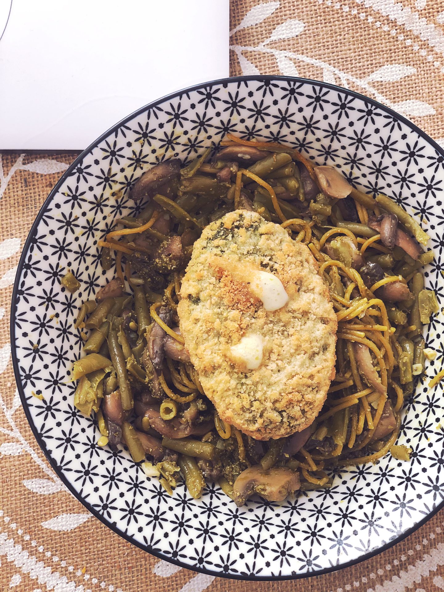 Le midi, je me cuisine une escalope végétale Herta épinards/fromage avec une poêlée d’haricots verts/champignons et d’un peu de pâtes pour les féculents.