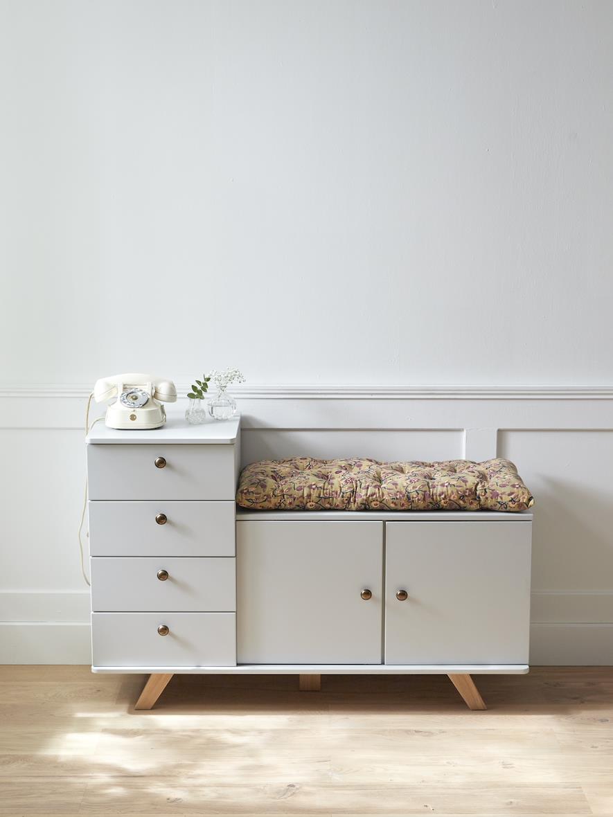 Cette petite commode au design rétro est un meuble très pratique, qui trouvera sa place aussi bien dans une entrée qu’une chambre d’enfant. Sa petite banquette permet de s’asseoir pour enfiler ses chaussures, par exemple. Installez quelques coussins dessus et une jolie lampe pour accessoiriser l’ensemble.