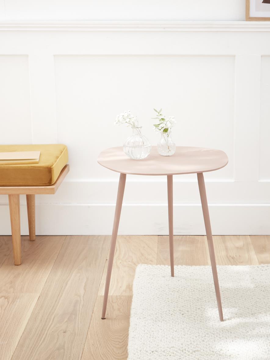 Autre style, plus moderne, pour cette table d’appoint en métal texturé. Sa jolie couleur rose pastel est parfaite pour une décoration douce de style scandinave.