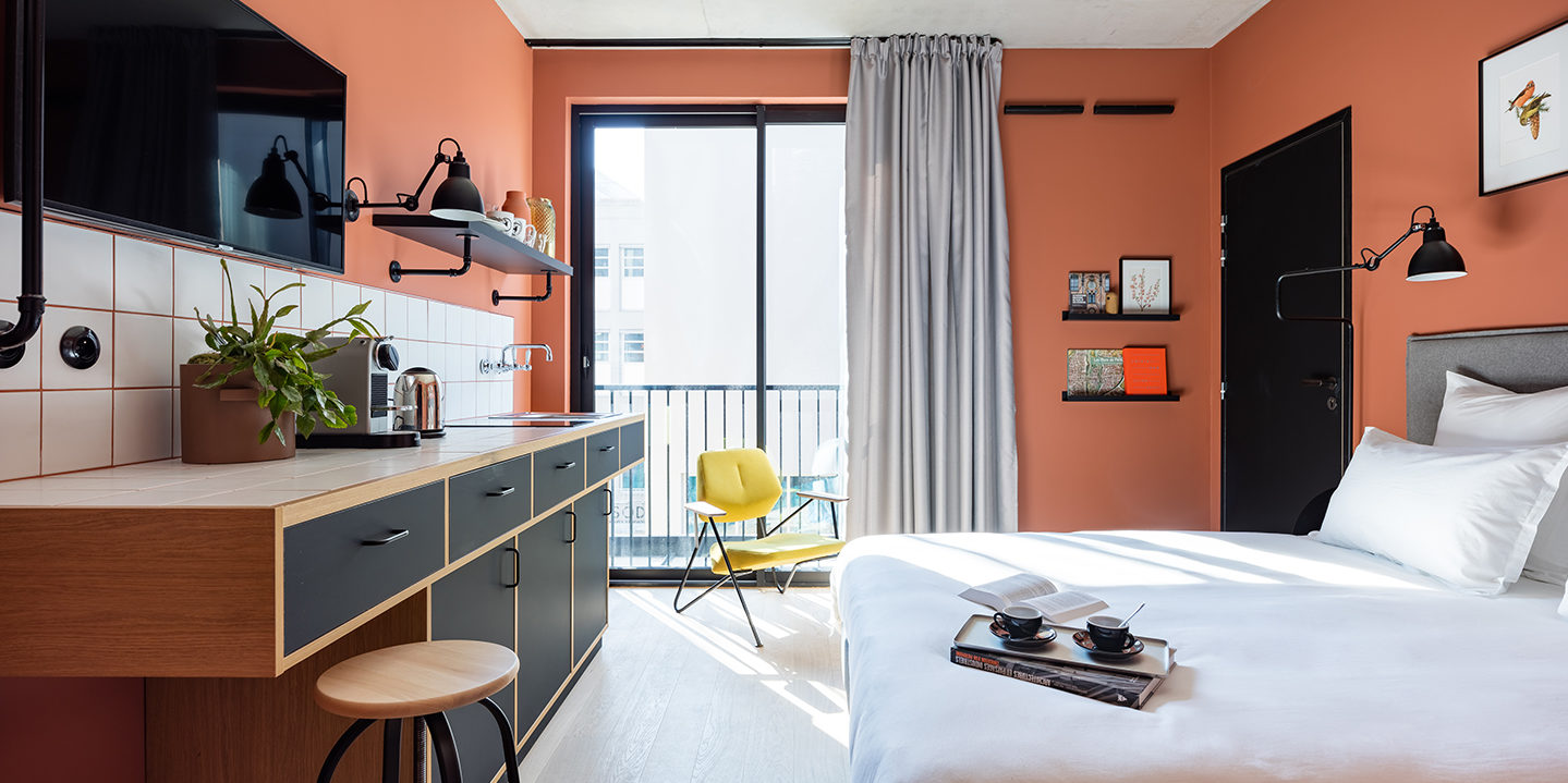 Le Deskopolitan Voltaire compte donc une offre hôtelière, avec 14 chambres qui se situent dans un bâtiment dédié. Les chambres sont soigneusement décorés dans un style boho-moderne.